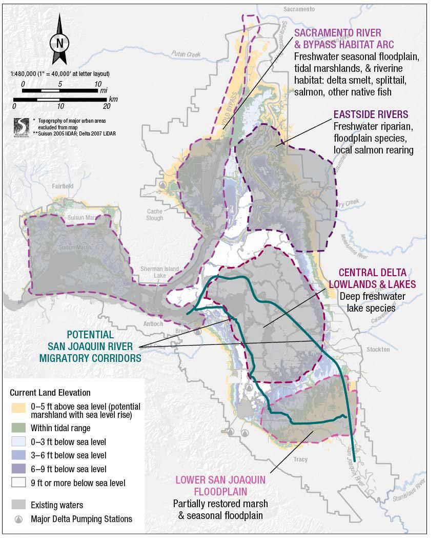- Sacramento River and Bypass Habitat Arc: The western and northern Delta would be an arc of tidally connected habitats extending from Suisun Marsh and Big Break into the Yolo Bypass and parts of the northwestern Delta. This habitat arc would be specialized to support native species and recreation.