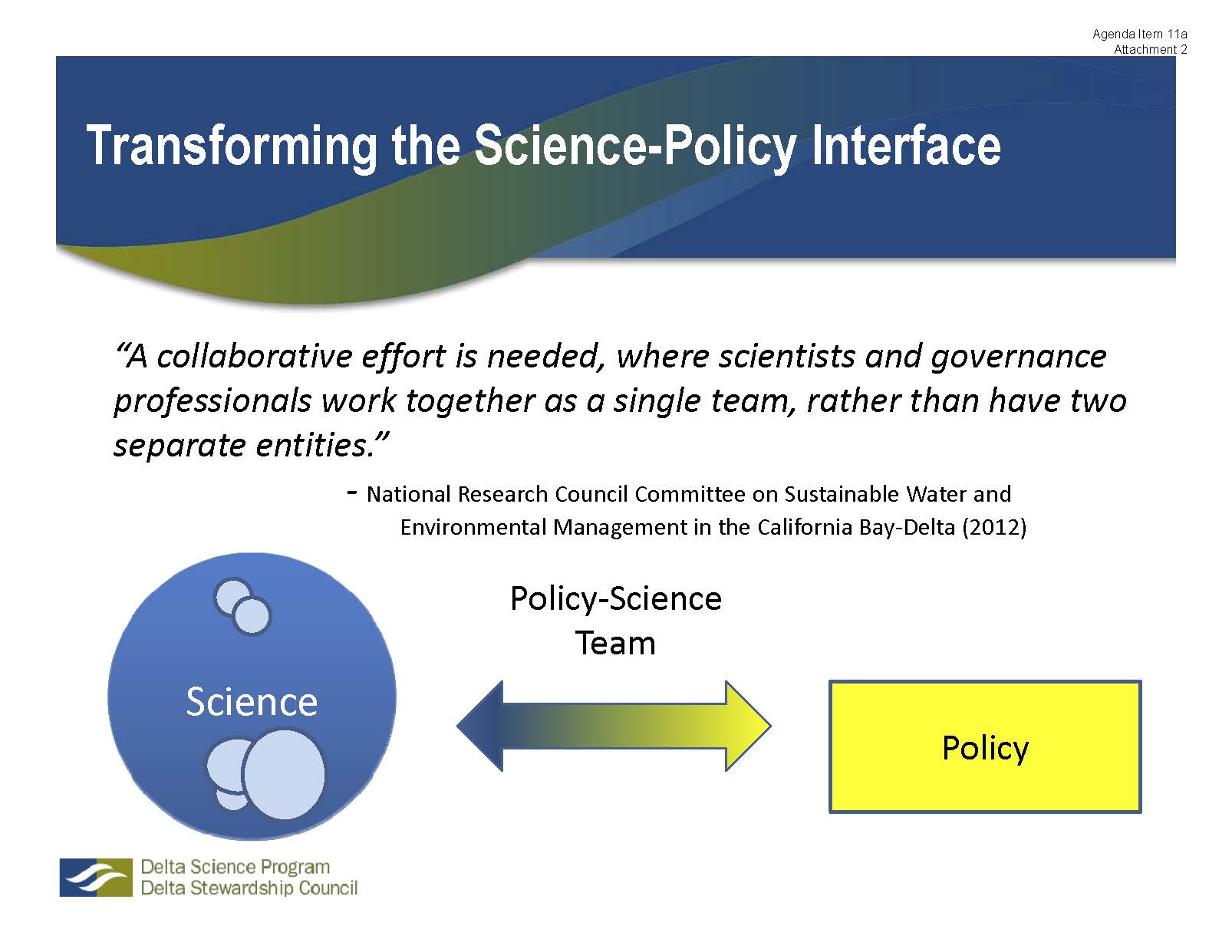 We’re really looking to move beyond the status quo for science in the Delta, he said. “The synthesis is what the NRC came down on very heavily. Essentially what they were saying was that there is really great science being done for specific science questions, often in the short-term. But what is taking a look across the various programs? Scientific uncertainties are not excuses for inaction, and the clear understanding of tradeoffs – if you’re making one decision against another or comparing alternatives, having a clear statement of what that means. So this is the vision we started with and you approved at the beginning of the year – how do you build an open Delta science community that works together to build this shared body of knowledge.”