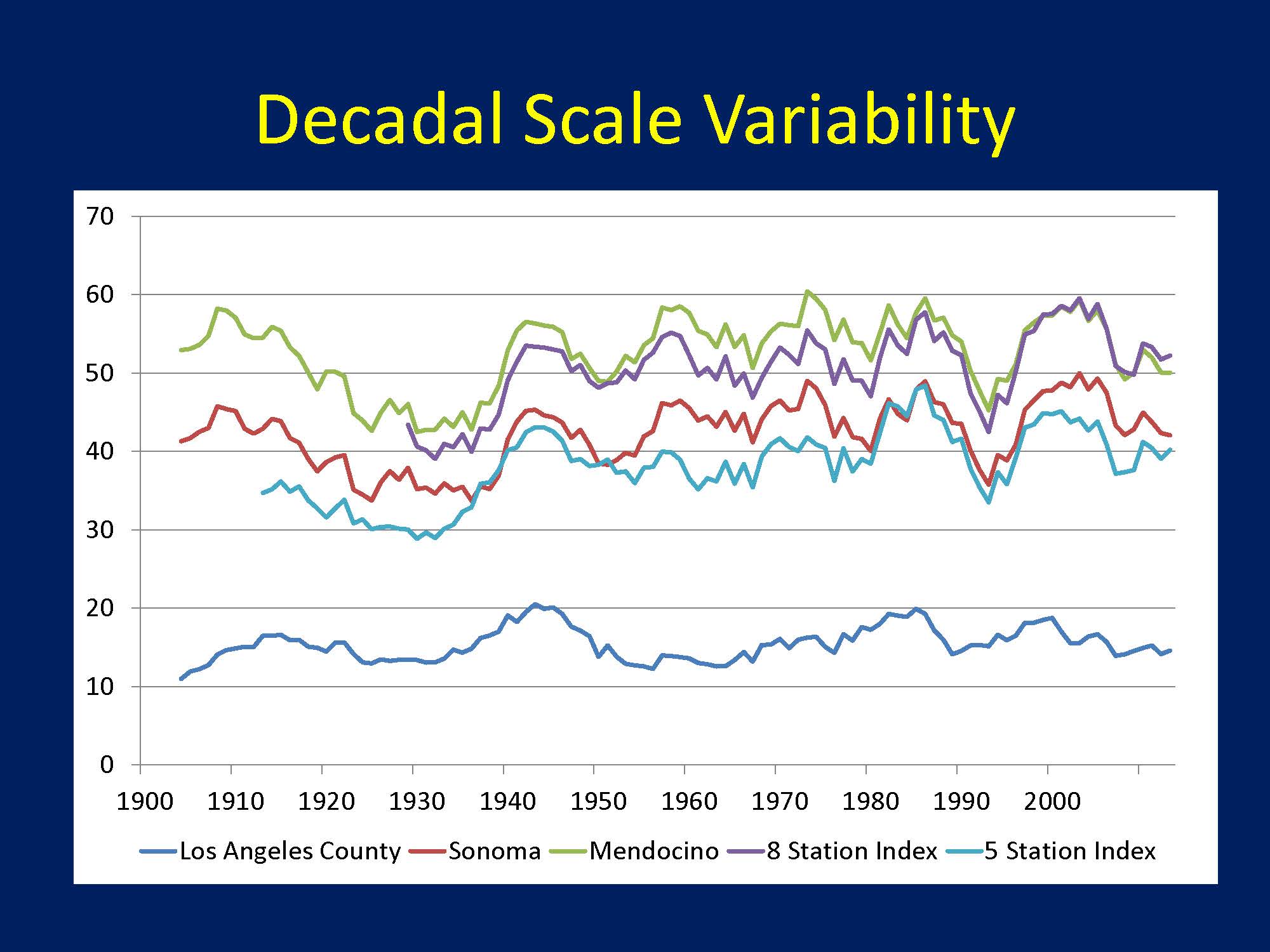 He then presented a graph that plotted precipitation in Los Angeles, Sonoma and Mendocino counties, the Northern Sierra 8-Station Index and the San Joaquin 5-Station Index across for the period of record. “You see the large fluctuations and in some cases, a decadal scale variability of 10 to 15 inches up in the north,” said Mr. Anderson. “That’s a pretty sizeable fluctuation. I can tell you it fluctuates, but I can’t tell you why.”