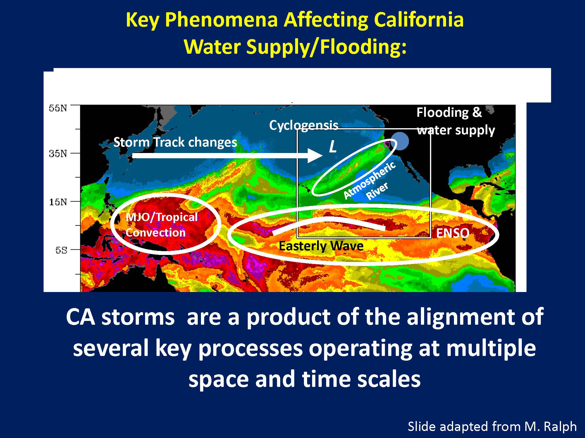 Just a few storms are at the core of California’s water supplies, he said. He explained that there is another process called the Madden Julian Oscillation, which is a very large-scale organized convection that propagates across the tropics in the Eastern Pacific to create ‘atmospheric rivers.’ “This is concentrated moisture happening in the first 5000 feet of the atmosphere that goes right across the ocean and runs into California, and what do you suppose it runs into,” he said. “We have some hills that get in the way, and they’re actually very effective in making that water fall out of the sky, but again it depends on the dynamics of that winter storm system that are driving it. If it’s a warm system, there’s a lot of rain that can happen, and if it happens for a long enough duration, there is flooding. If it’s a colder storm, these can be absolutely fantastic for water supply. Entertainingly enough, we saw one of each this year. A little bit of everything.”