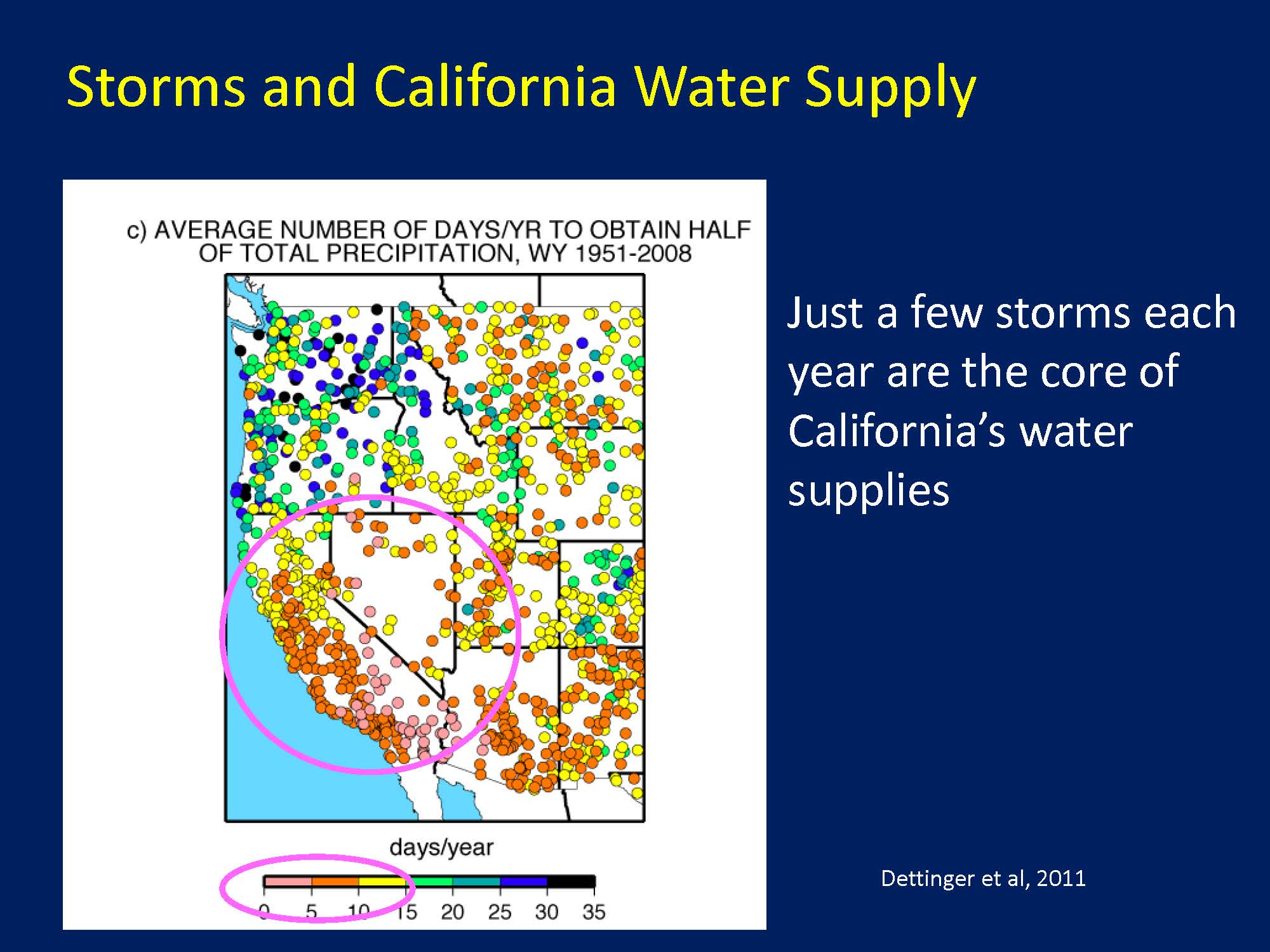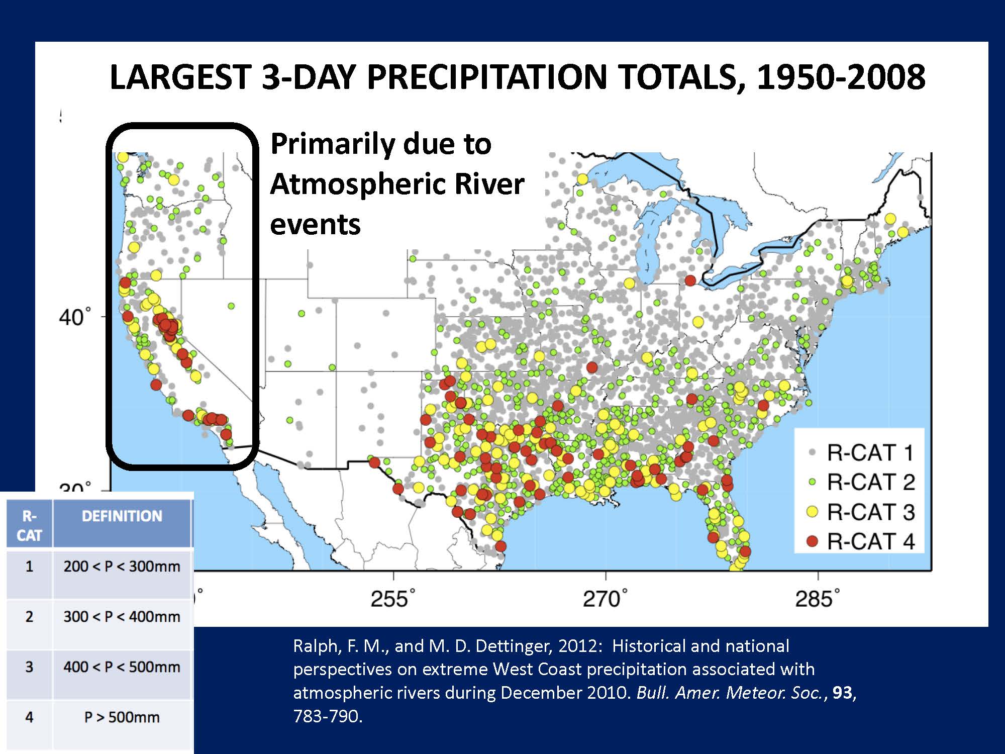 We don’t have a scale to say how big these storms are yet, so Michael Dettinger and Marty Ralph started working on it by taking 3-day totals of precipitation and categorizing them by size, just to see how do these storms rate, compared to the rest of the country, he explained. “You can see that California’s big events here rival the Gulf Coast hurricane belt quite well, so just as big, but you can imagine we rely on them. Those are atmospheric river events.”