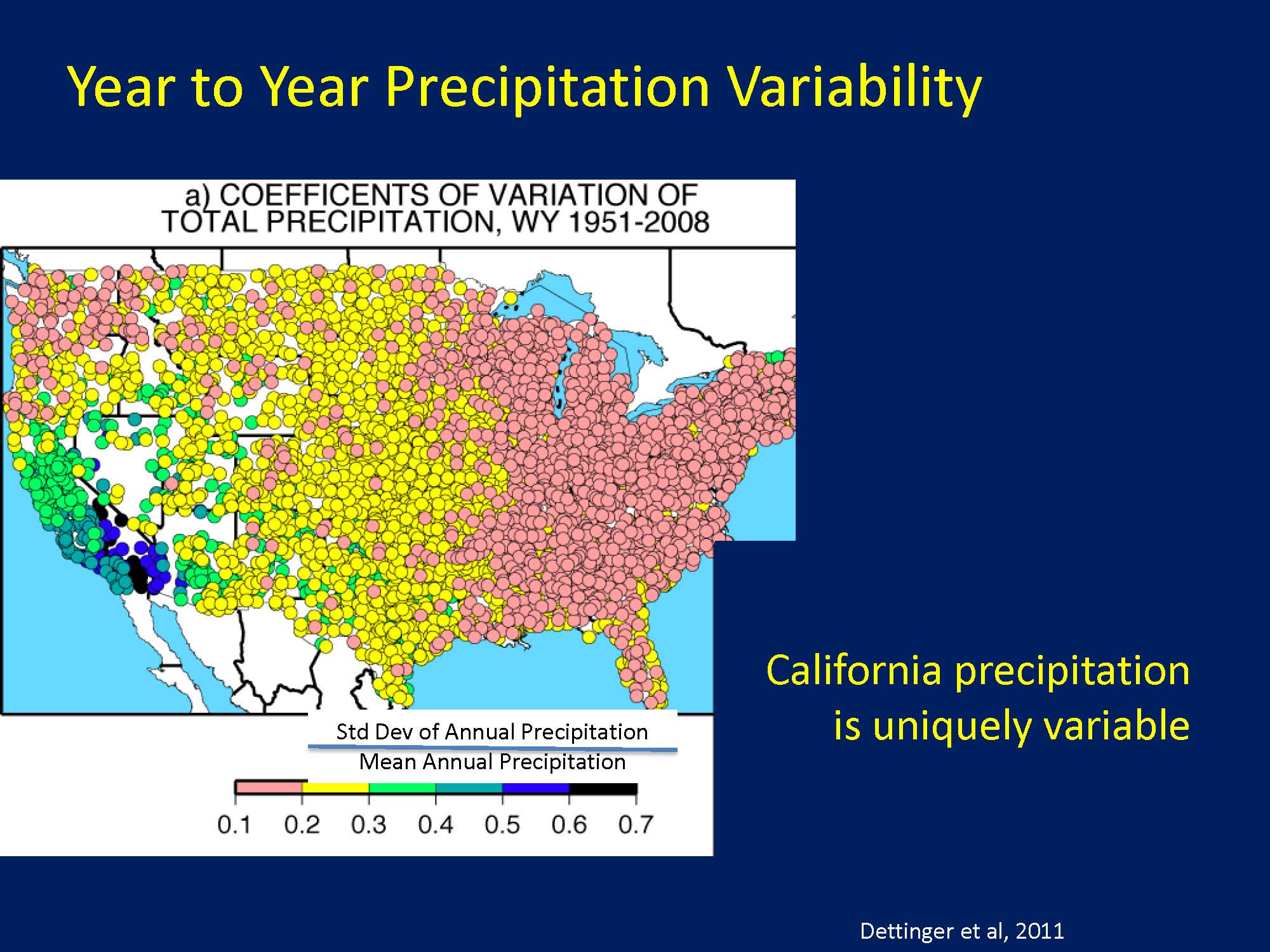 “California is different than the rest of the country,” he said, presenting a chart that shows the variation in precipitation across the country. “This is very helpful when you talk with your federal partners. Remember, the federal partner is back east in DC; look at their variability. One year looks like the next year looks like the next year … You see federal programs set up that reflect that behavior, and sometimes they have a hard time interfacing in an area where one year can look absolutely nothing like the next or as we found out this year, the year can start one direction, fake, and head the other direction in a hurry.”