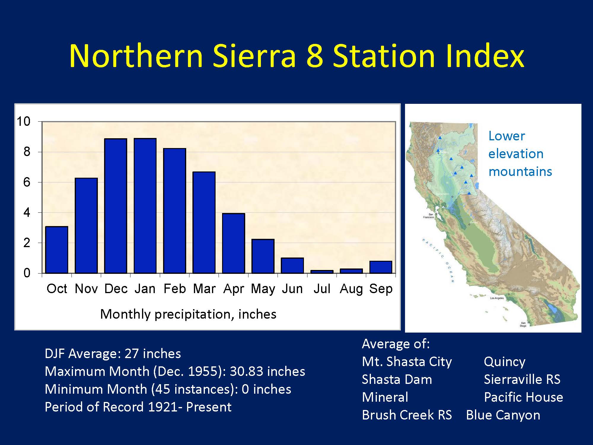 Over half of the annual total occurs in December, January and February, he said. “The biggest month was over 30” in December of 1955 which produced a very large flood that actually is the foundation for most of the Central Valley flood management system,” he said. “As for the minimum month, there have been 45 times where we have yet to find a drop of rain, which is expected in the summer time but it has happened in December. That gets to be a problem.”