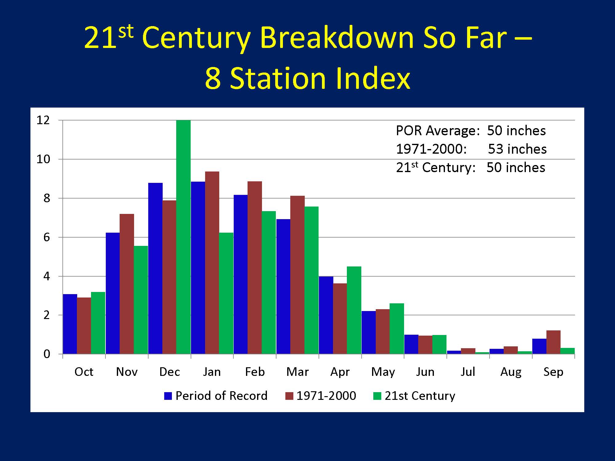 He then presented a graph of showed the 8-Station Index for the period of record, as well as the last 30 years of the 20th century. He pointed out that precipitation in January, February, and March is increasing, while precipitation is decreasing in December. “Mother Nature’s take a left turn here,” Mr. Anderson said. “You can see where this can challenge trying to operate a system when you have rules that only tell you when you can do what with water.”