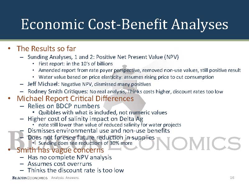 “As for Dr. Michael, his critical difference is has to do with more of a theoretical construct,” said Dr. Thornberg. “He actually more or less accepts most of the BDCP numbers that Dr. Sunding came up with. He simply quibbles about which ones should be added and which ones shouldn’t be added in. The only place he really comes up with a different cost has to do with the salinity impact of the ag; he has a higher salinity impact, although it’s worth noting that his negative salinity impact on in-Delta ag is still smaller than the positive economic impact of better salinity levels for the water going to the two water projects, so in a sense, it’s kind of an irrelevant point. He dismisses again all the environmental use and non-use benefits and he does not see as noted future reductions in supply. Dr. Smith, as already noted, doesn’t have a complete NPV analysis, but he’s worried about cost overruns and thinks the discount rate being used is too low because it’s not accounting for the risk of the particular project.”