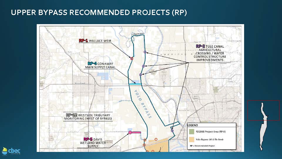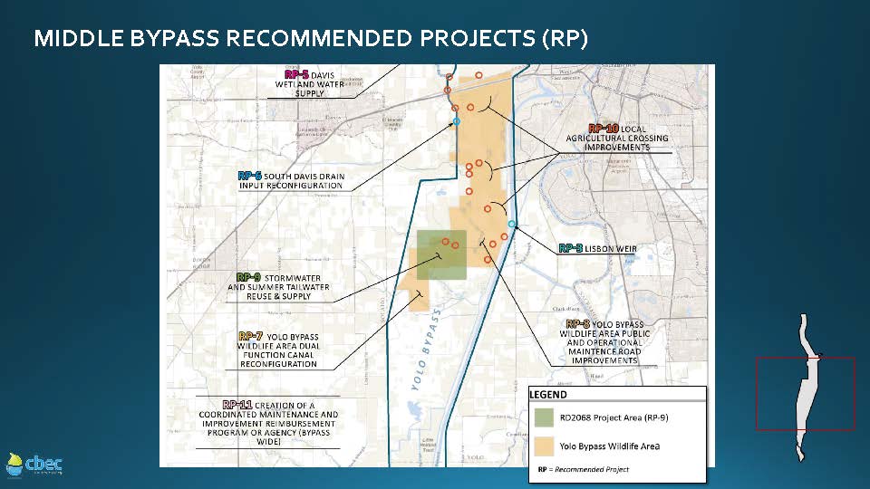 The projects are located up and down the bypass with five projects in the upper bypass and five projects in the lower bypass, she said. The projects include weir, drainage canal, ag crossing and road improvements, as well as development of a bypass-wide system for maintaining vegetation and silt in the canals.