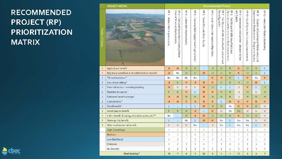 They worked with stakeholders to select criteria to rank projects, and had stakeholders draw on maps where potential improvements could be made. The focus was on drainage and water infrastructure improvements that would benefit these wetlands managers and farmers, so they asked the people who knew best what projects would improve drainage and water infrastructure in the bypass, she said. The result was a list of 12 projects and a list of criteria to rank those projects. “The study is coming out next week, and it ranks the projects from 1 to 12,” she said.
