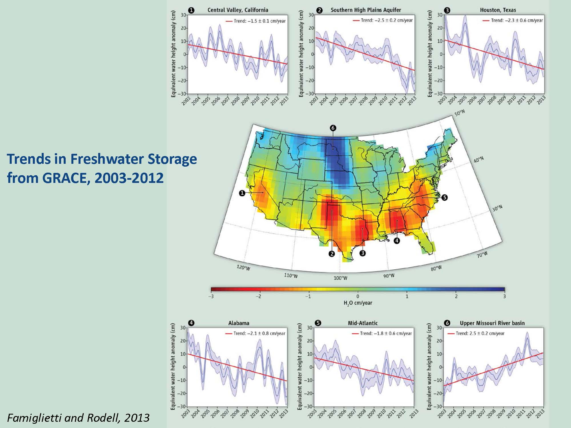 He then presented a slide with some of the results. “This is a map of the U.S. that we published last year that show the trends of water storage over the last decade or so,” he said, noting that the blue areas are gaining water and the red areas are losing water. “You see a couple of things. The northern half of the country is getting wetter and the southern half of the country is getting drier. We have some very distinct hot spots including the Central Valley and the southern high plains, and the southeast is far worse than people have really expected.”