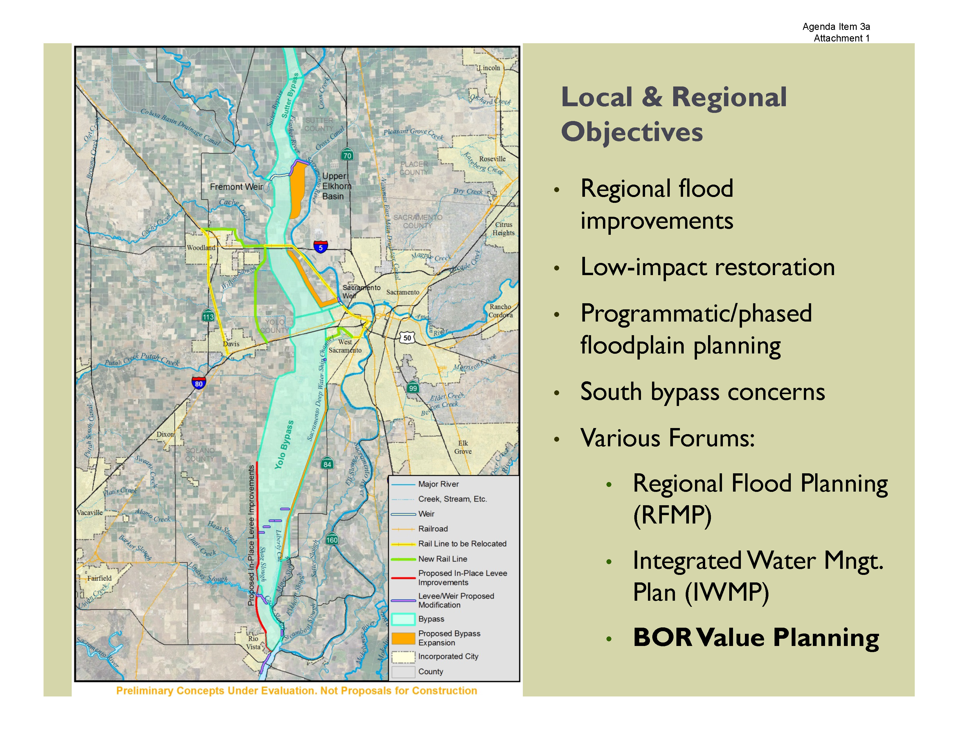 He then presented a slide of a map showing a representation of some of the local and regional concepts that have arisen. He said that several issues have come up through the course of the local and regional conversations, including the idea of ‘low-impact restoration.’ “The Yolo Bypass is a very strong agricultural center, and there an interest that when we do restoration in the Delta, we do so in a way that retains the sustainability for the local agricultural economy,” he said. “There’s also an interest in looking at the permitting mechanisms and permitting process for the biological opinions in particular. It’s potentially a mix of project level and programmatic permitting.” He noted that there is also an interest in a phased approach to restoration in the bypass.