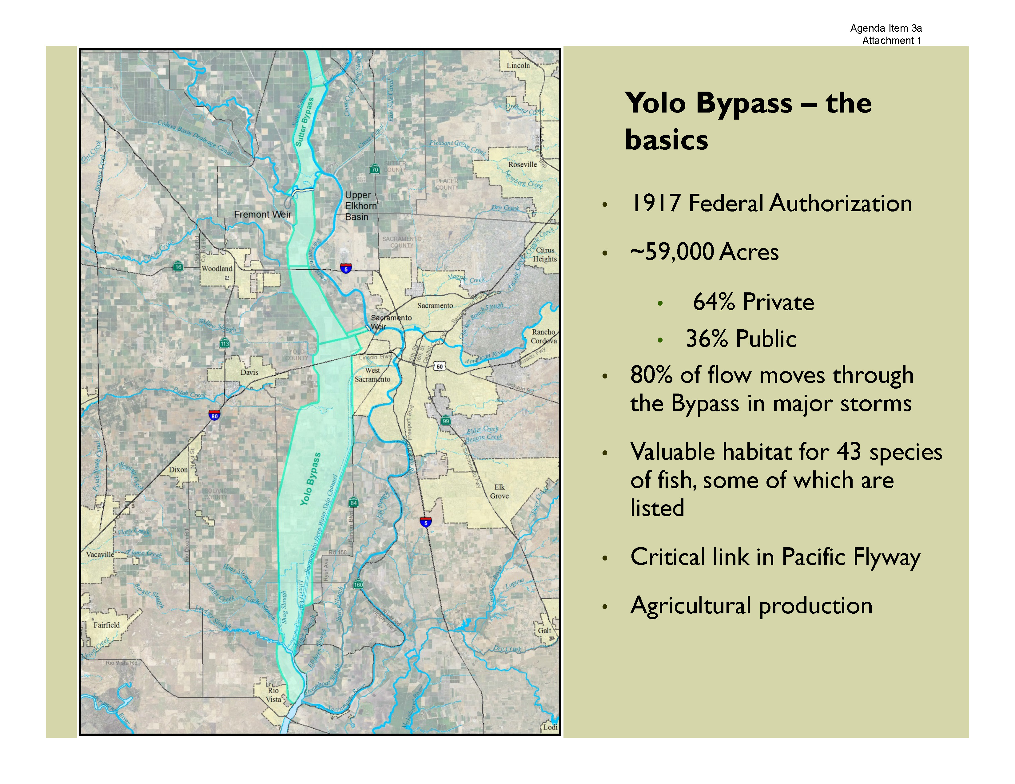 Mr. Tjernell then gave some facts about the Yolo Bypass. Federally authorized in 1917 as a flood control facility, the Yolo Bypass is first and foremost a flood control facility, he said. He noted that it is roughly 60,000 acres located to the west of Sacramento, and that two thirds of the land is in private ownership and one-third is publicly owned, the majority being the Vic Fazio Wildlife Refuge and other lands in that area.