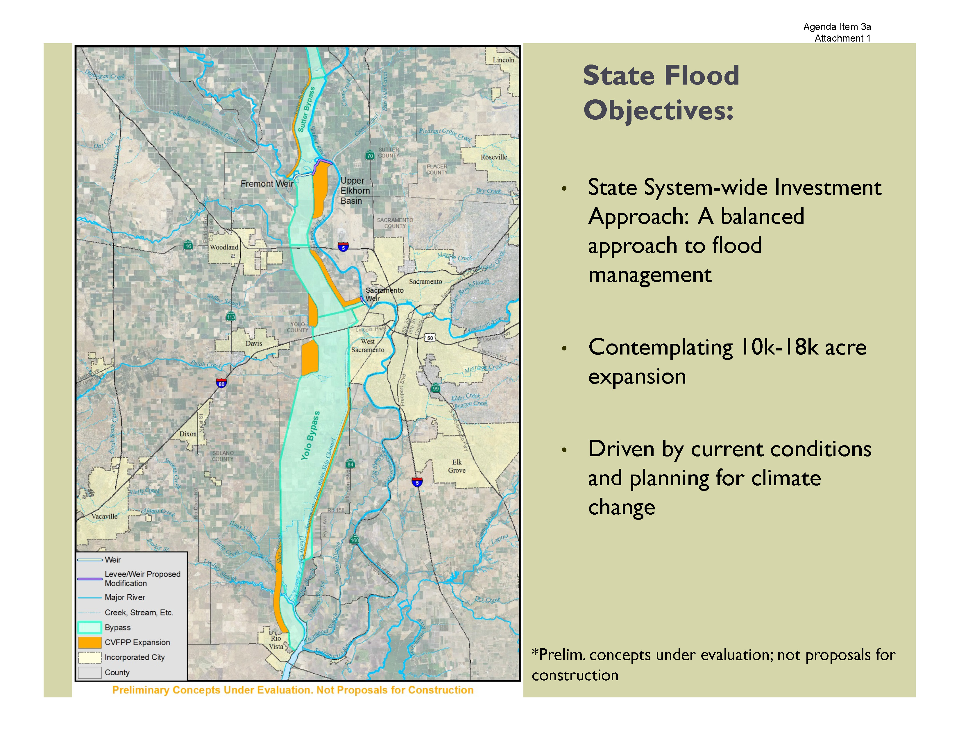 He then presented a map of the Yolo Bypass overlaid with the state’s flood objectives, emphasizing that this is just a preliminary concept for flood projects in the bypass. He noted that the orange areas are the areas that are currently being thought of, at least conceptually, for increasing the flood conveyance capacity of the flood bypass. “We’re looking at relatively significant land use alterations, relative to the size of the overall bypass, along the order of 10,000 to 18,000 acres. Again, that’s very preliminary, but that’s the rough scale that we’re talking about. DWR Flood Management is considering the needs to increase the bypass capacity for both current conditions to help alleviate current stresses on the flood management system, and then also looking ahead to the next 50, 100, years towards the effects of climate change and the need to convey more water through the bypass then we are doing so today.”