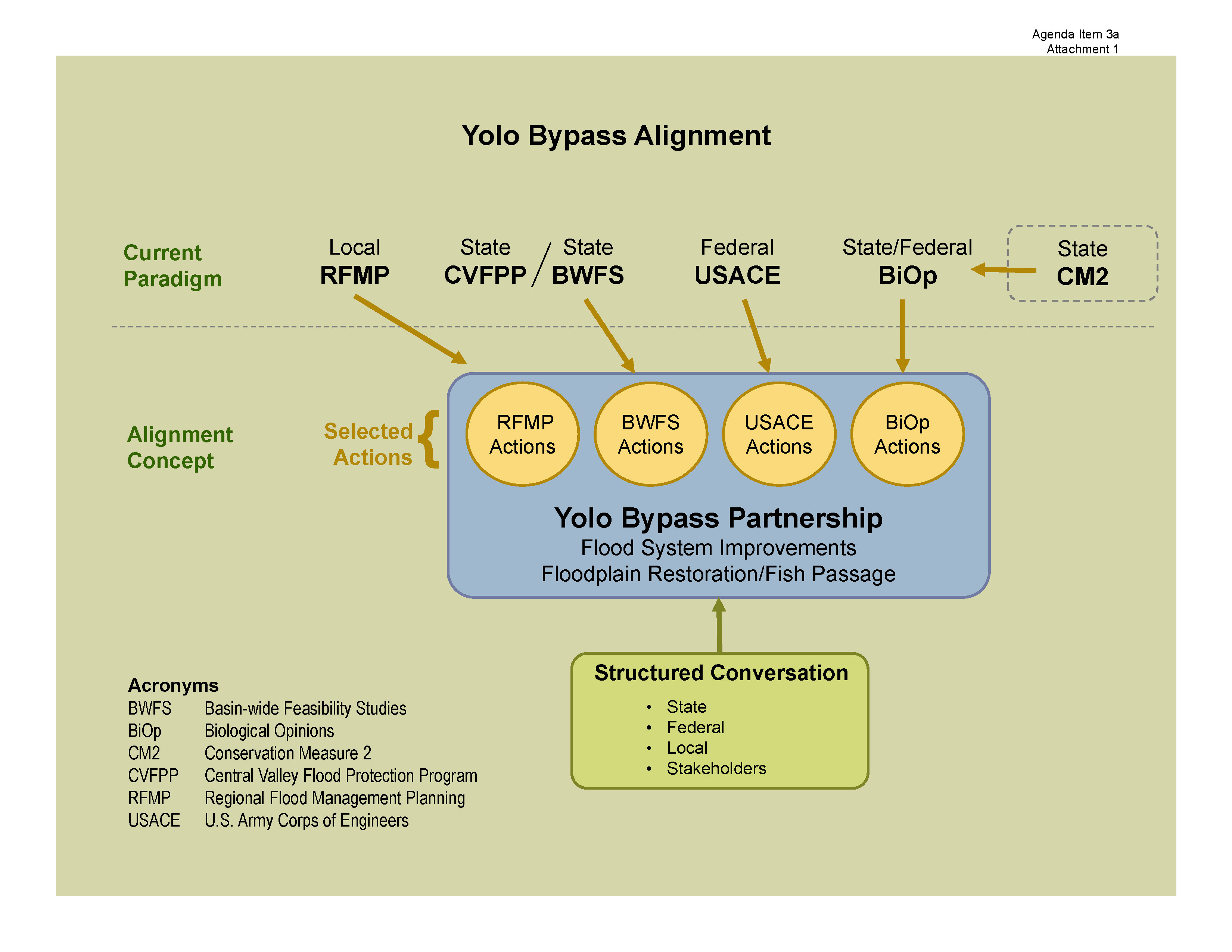 There’s a lot of effort being put into the bypass, Mr. Tjernell said, presenting a graphic of the Yolo Bypass alignment process. He explained that the top line represents all the processes currently underway, including the more locally-driven flood management processes in the lower Sacramento River region and north Delta area, the Central Valley Flood Protection Plan, the state-driven basin-wide feasibility studies, the federal interests which include the whole American River, Folsom Dam, and Sacramento Weir projects, the state and federal bioloigical opinions, and CM2 with the BDCP.
