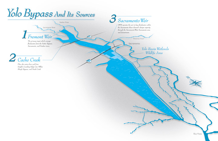 Water enters the bypass at its northern end over the Fremont Weir when the Sacramento River reaches a crest of 33.5 feet. Flows also enter the Yolo Bypass from Knight’s Landing Ridge Cut, Cache Creek, Willow Slough Bypass, and Putah Creek. Additional water enters from the Sacramento Weir located in West Sacramento adds flow from the American River. The waters collect and flow out to the Delta just above Rio Vista. As the floodwaters recede, the basin empties through the Toe Drain, the perennial riparian channel on the east side of the bypass.