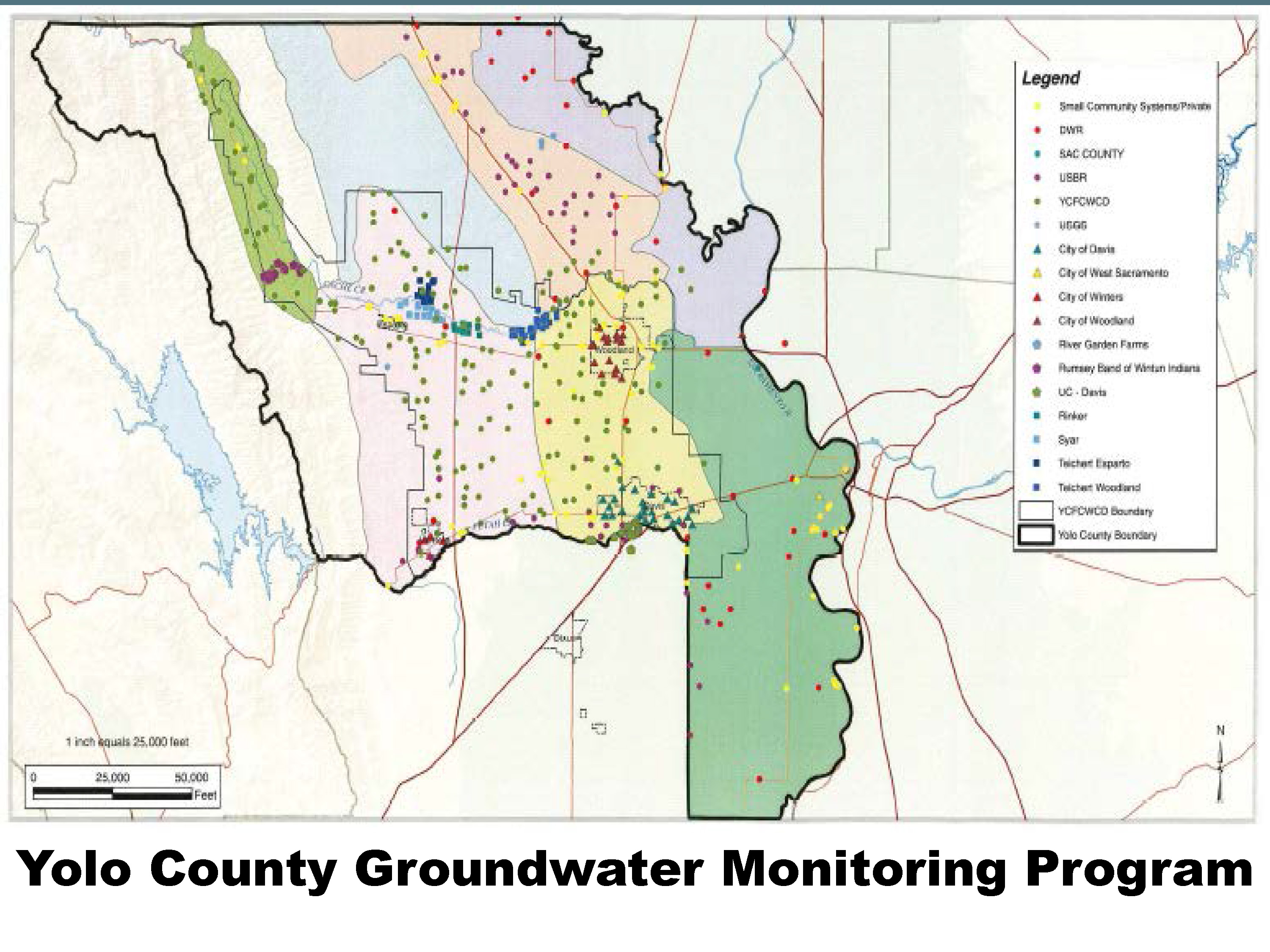He then presented a slide showing Yolo County’s groundwater monitoring program, noting that the dots represent monitoring locations that goes into a public database. “You can log on to it and if you wanted to know what the groundwater contours for the last 30 years are in the City of Davis, you can do that,” he said. “Having the data and actually understanding it … It used to be in water districts that you’d say, ‘Don’t give up our data because they’ll sue you over it.’ But I’m in the district that takes a different approach of being very transparent and open with the data. My rule is, it’s not who has the data that wins the day, it’s who understands the data and can argue what it says. And so we were very open and we tried to organize it so that the public can use it.”