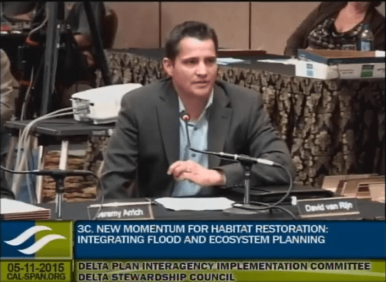 He then introduced his panelists: David van Rijn with the Bureau of Reclamation, Jeremy Arrich with Department of Water Resources, Division of Flood Management, and Yolo County Supervisor Jim Provenza.
