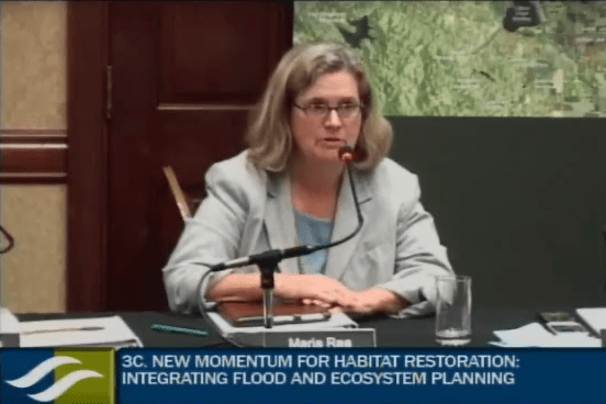 Maria Rea, Assistant Regional Administrator for NMFS gave some perspective on the NMFS biological opinion. “When we looked at the continued operations of the CVP and the State Water Project, the operations of those reservoirs as they continue to affect access to floodplain for juvenile salmonids is really critical, and as we did our recovery plan, and that lack of access to floodplain habitat is one of the highest stresses for lack of ability to recover these species …. From my perspective, it’s just really key that we try to find ways to get some increased flood inundation and certainly the upstream passage component fixed as soon as possible while still recognizing there may be some larger build out for increased flood capacity that also has to go on, so the staging of these different components is really key and I look forward to that discussion … “