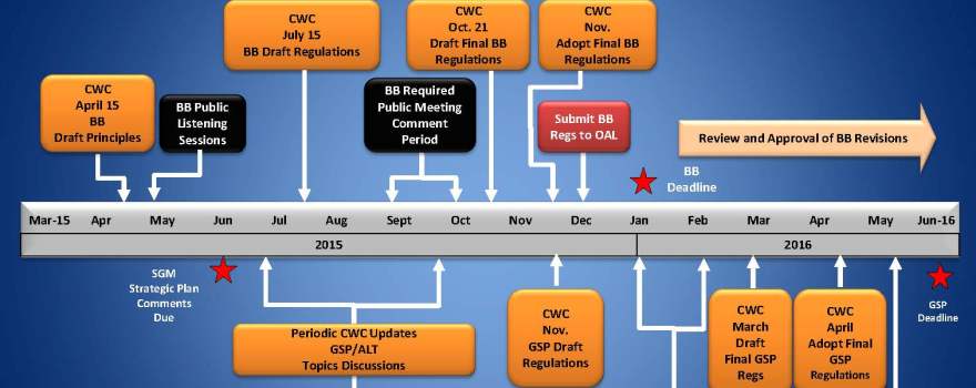 He then put up a timeline, noting that the basin boundary regulation timeline was on top, and the groundwater sustainability plan regulation was on the bottom. “It’s important to show the integration of the boundary regulations with the GSP regulations as we’re moving on this concurrently,” he said. “This summer we plan to come before the commission to give periodic updates on the GSP regulations. We plan to have the GSP draft regulations out in the winter timeframe, hold our required public meetings, and then adopt the GSP regulations in the spring of 2016.”