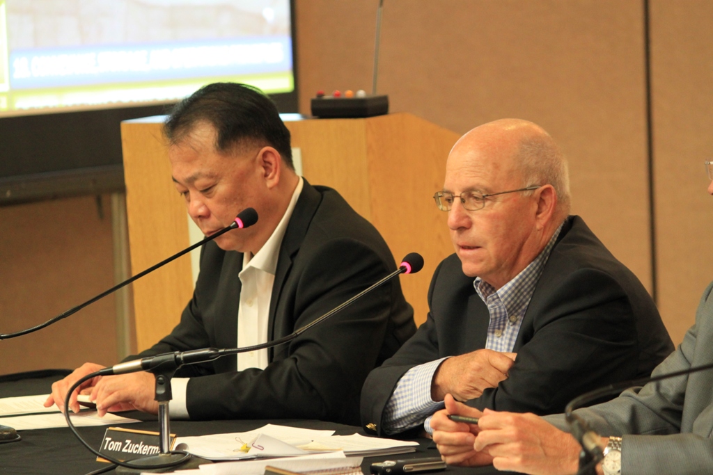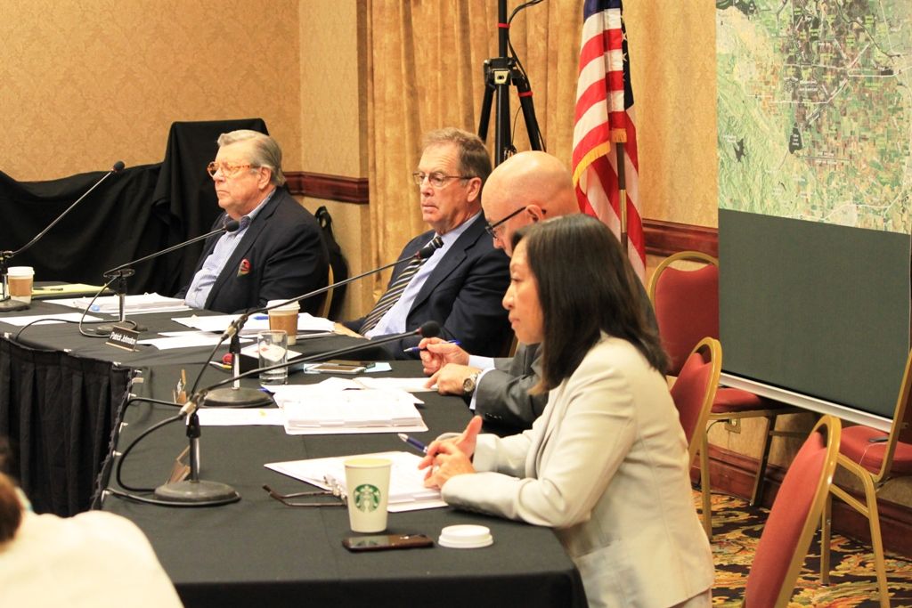 The panel was then brought forward to give their thoughts on the proposed principles. On the panel today, is Lester Snow, Executive Director of the California Water Foundation; Buzz Thompson, Professor of Natural Resources Law and Director and senior fellow at Stanford Woods Institute for the Environment; Tom Zuckerman, water law expert and Delta resident; and Robert Shibatani, a managing hydrologist and CEO for Shibatani Group International.