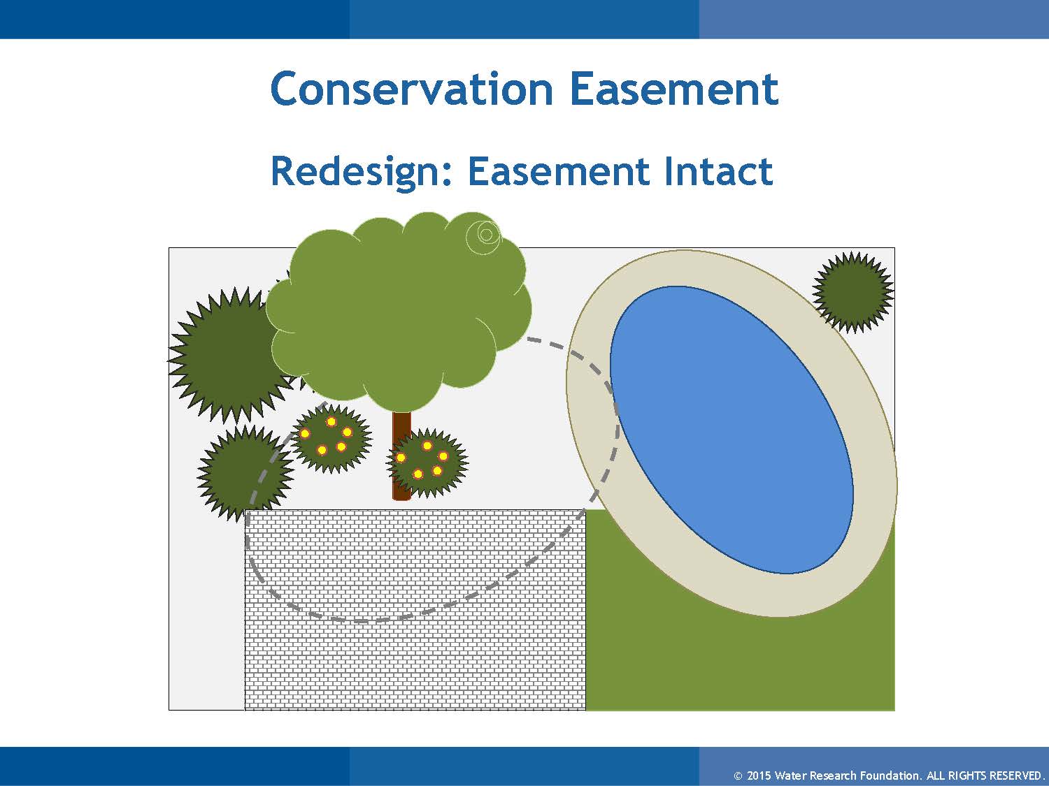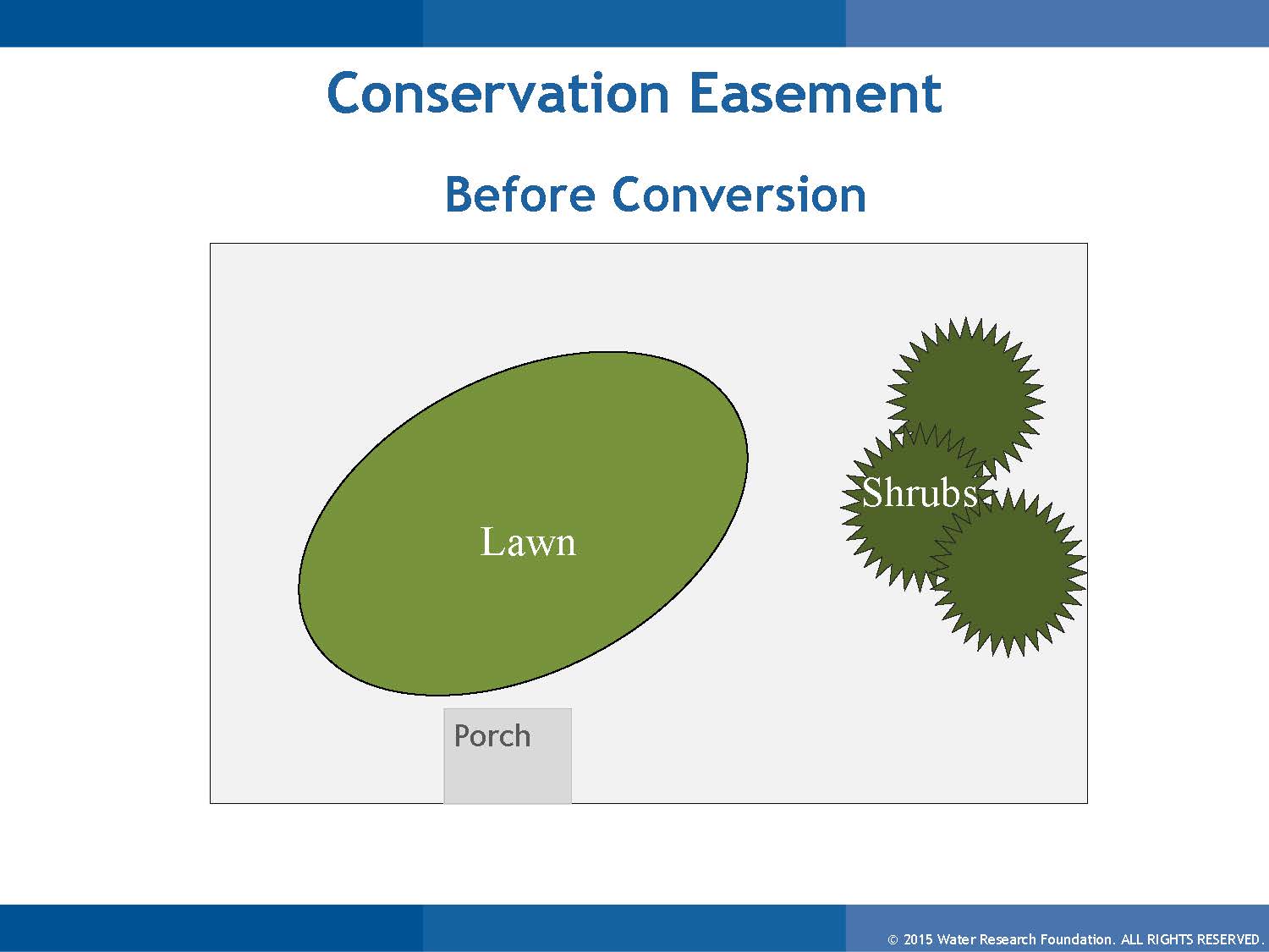 He then showed an example, starting with a slide showing a lawn taking up a portion of the back yard, and then a second slide after the conversion. “This is what’s recorded; the conservation easement drawing and easement areas identified in which no grass, no sprinklers, no open water can exist in perpetuity. If there is a change in the owner and the owner has young kids and wants to put in a pool and even some grass, they could still do that but not in the conversion area. So that’s basically it, the conversion area is sustained in perpetuity as the non-water surface, non-grass area.”