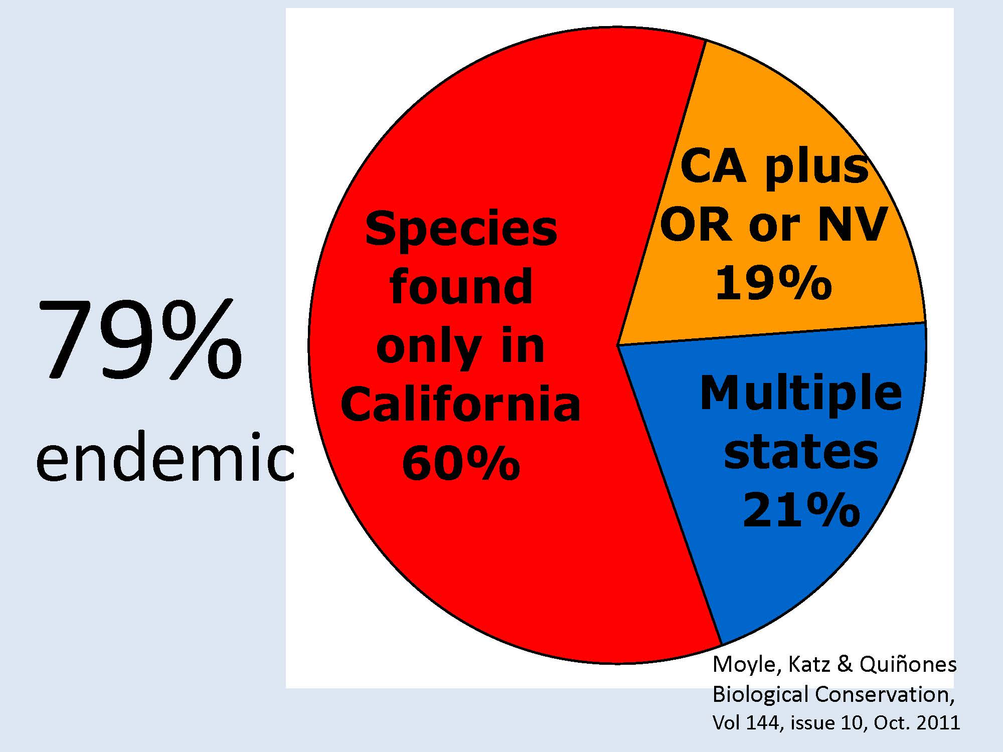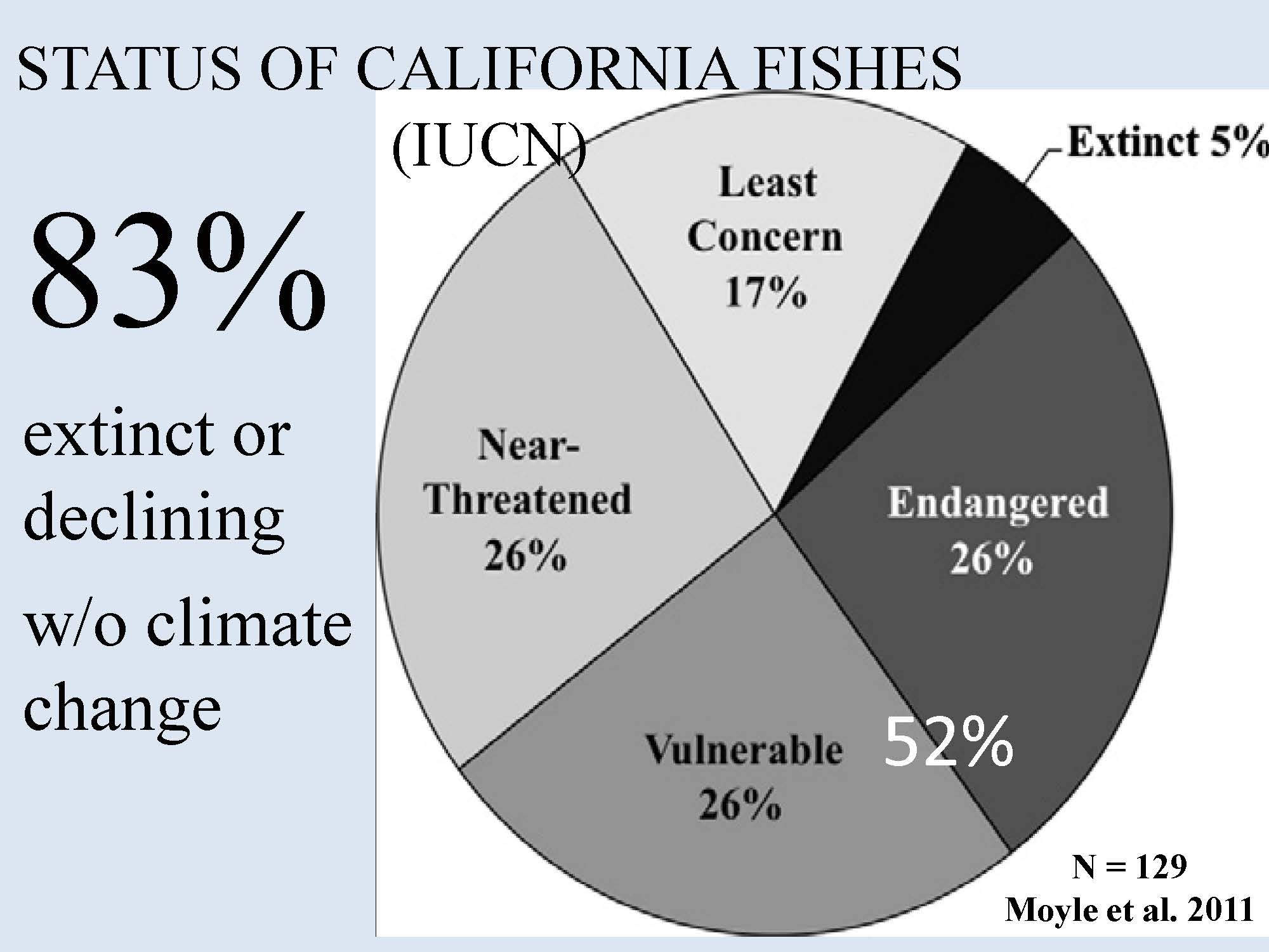 Dr. Moyle is the lead author on for the Department of Fish and Wildlife on fish species of special concern. “That report now contains 63 species, describing why these species are in trouble and why they are in general decline, and that is on top of 30 species that are already listed under the state and federal endangered species acts,” he said. “You know how hard it is to get a species listed, but at the same time we know there are a lot of fish in trouble in the state, and this is the documentation of it.”