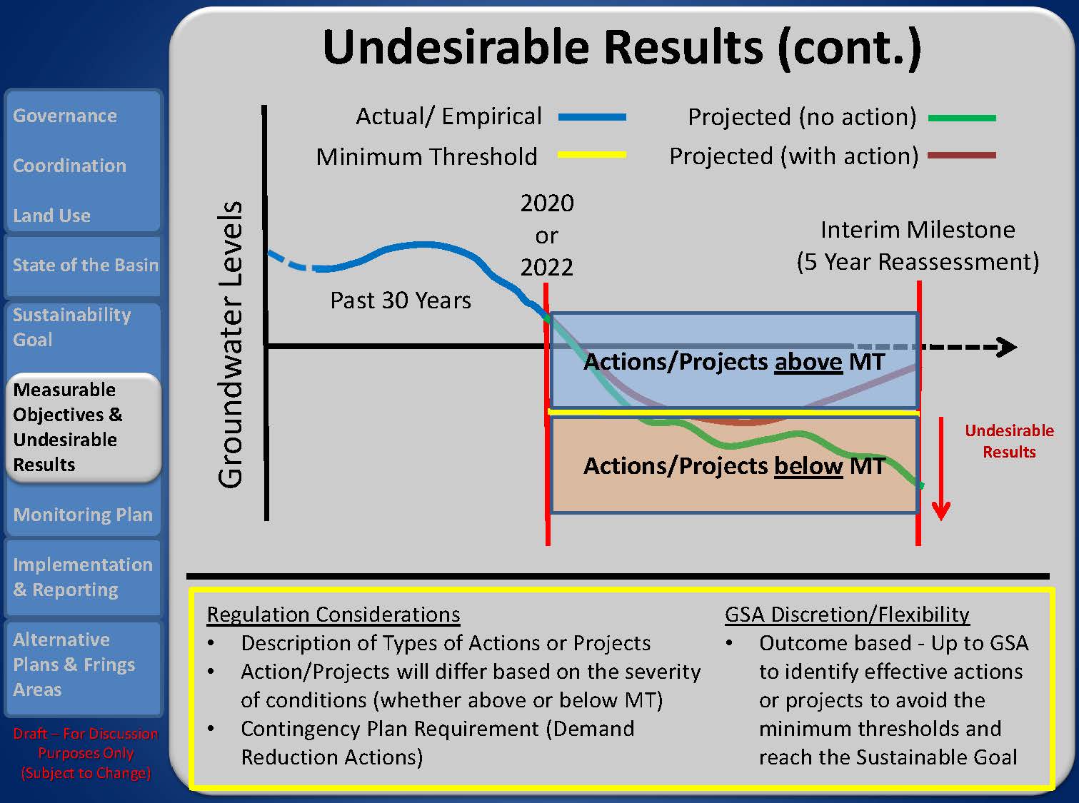The Sustainable Groundwater Management Act states that GSAs shall develop measurable objectives and interim milestones in increments of every five years to achieve the sustainability goal, which is avoiding these undesirable results at significant and unreasonable levels within the 20 years of implementation of the plan, he said. Measurable objectives are similar to prior groundwater management plan basin management objectives; a measurable objective is a management statement and a measurable metric that is defined at interim milestones for each undesirable result, he said.