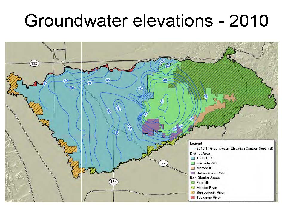 He presented a slide of the Turlock groundwater subbasin, noting that the blue represents TID’s territory, and the green is non-irrigated land to the east of their boundary. “What the slide is showing is based on sea level, the cone of depression to the east of TID’s boundaries that is a result of substantial new permanent crops that have been planted over the last 20-30 years that rely exclusively on groundwater to water their crops,” he said.