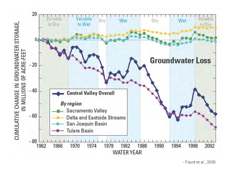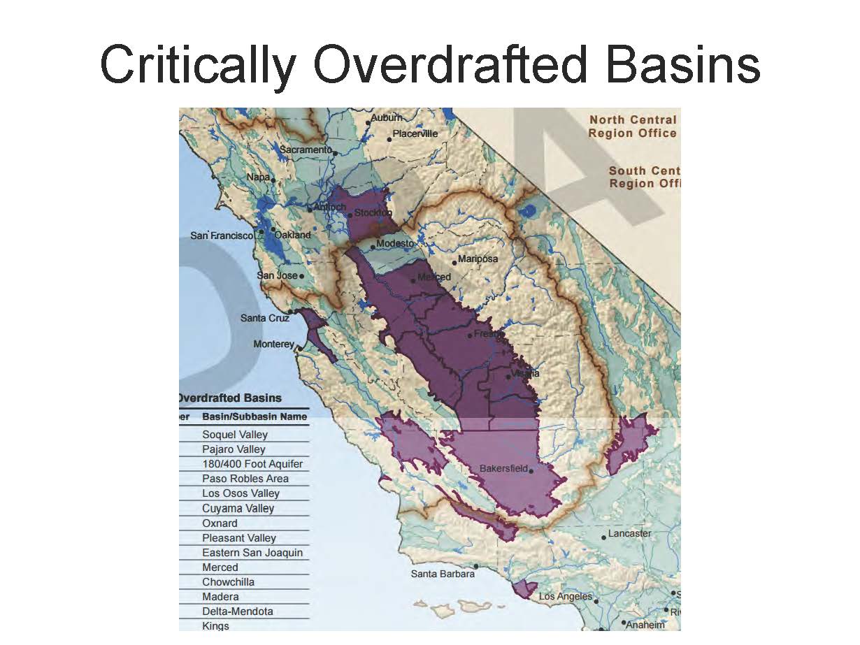 In the face of severe ongoing drought, many farmers and communities have turned to groundwater basins to supplement or replace their unavailable surface water supplies,. with disastrous results in some cases. Over-pumping of groundwater has depleted aquifers, caused wells to run dry, and the resultant land subsidence in some areas has caused roads, bridges, and other infrastructure to be damaged.
