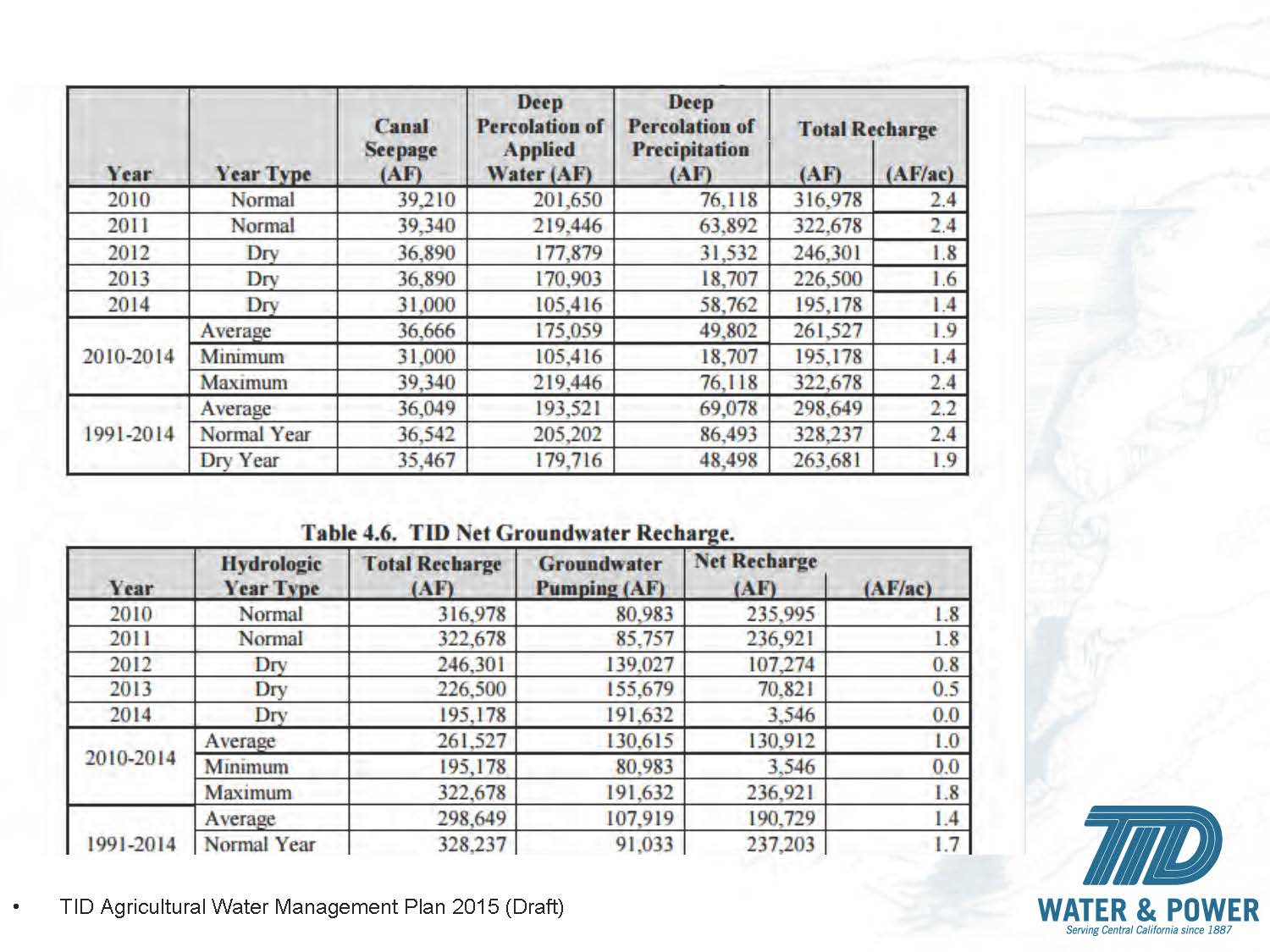 He then presented a slide with tables taken from their most recent ag water management plan that shows the amount of water returned to the groundwater basin each year inside TID. “It doesn’t reflect 2015,” he noted. “2015 was the first year in the last 50 that we went negative, so this is the first year, based on the lowering and lowering of our surface water allocation because of the drought, and the increase of pumping because of the need to water their crops out of the ground, that we actually pulled more water out of the ground than we put back in.”