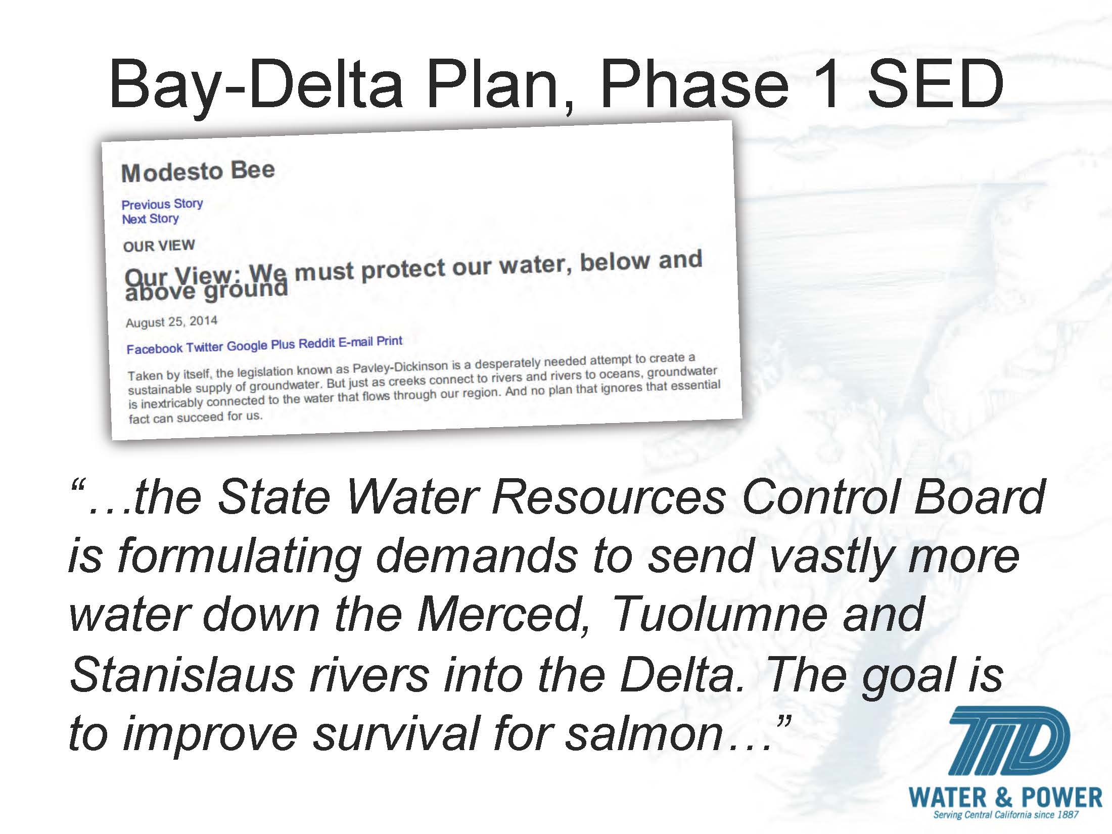 The Tuolomune River a tributary to the San Joaquin River, one that the current Bay Delta water quality control plan is currently revisiting. “The current proposal which is coming back out here soon from the State Water Board is potentially going to call for a substantial change in the flow regime that has historically been enjoyed by the farmers in our basin,” Mr. Frantz said. “Clearly, we all have to do our part to protect fish and wildlife, and there are a lot of additional measures, primarily non flow measures that can and should be done in the Tuolumne River, but we have to be cognizant of the impacts to groundwater when we make substantial changes to surface water use and surface water diversions.”