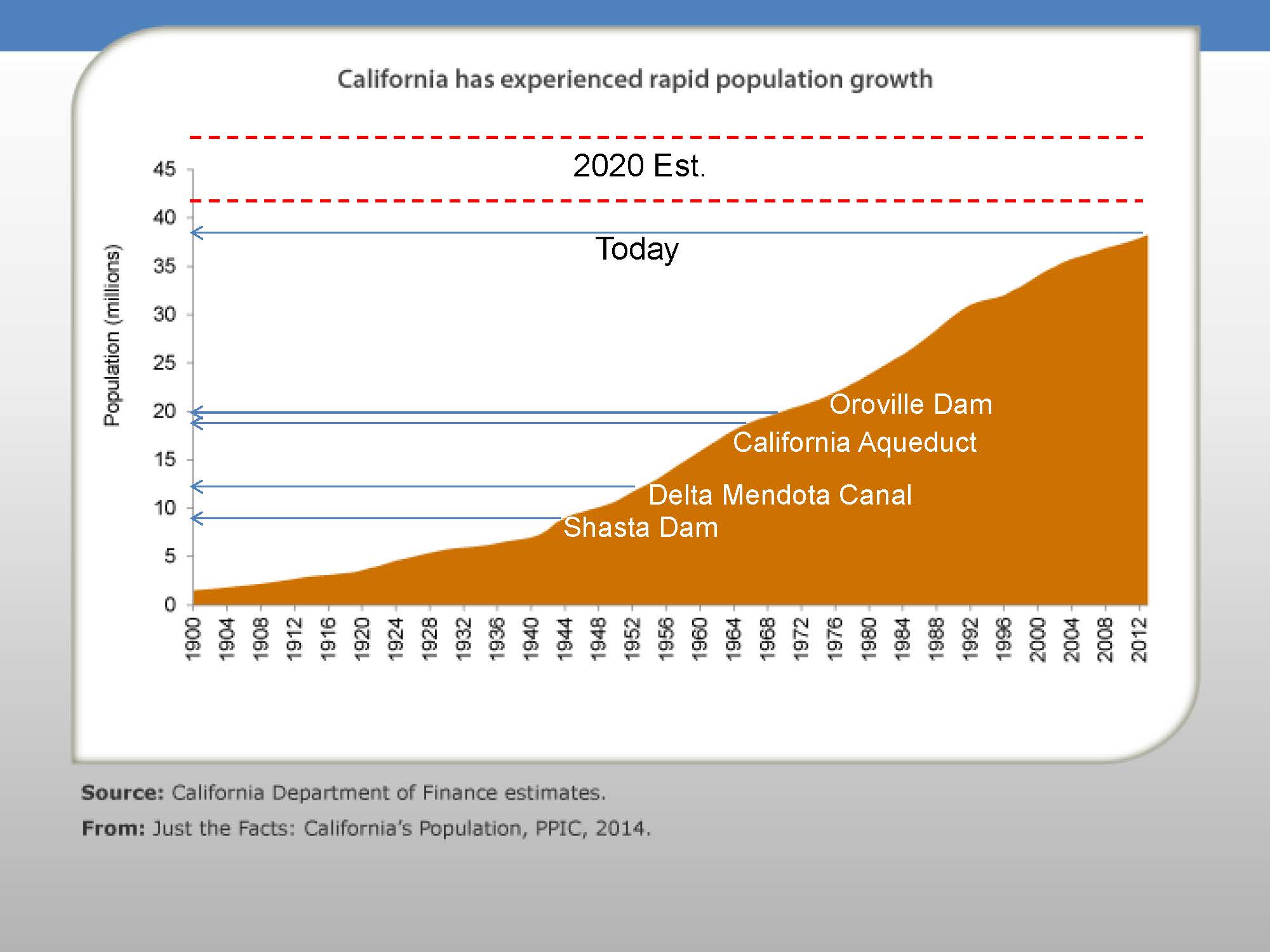 The other driver is the growth in population: Shasta Dam was completed when the population of California was 8 million people; when Oroville Dam was constructed in 1972, there was about 20 million people, he said. “There have been lots of other locally derived storage projects and many groundwater banking projects, so this isn’t the only water infrastructure that California has invested in the last 40 years, but most of the big state infrastructure was developed in this period between 1944 and about 1974, about 40 to 70 years ago,” he said. “If we look at where our population is today, we’re about 38-39 million, with an estimated population of somewhere between 42 and 47 million possible at the end of the spectrum, so we’re not plumbed for this. There are different needs and different calls on what is a limited resource in the state, and the state needs to engineer their way out of this dilemma.”