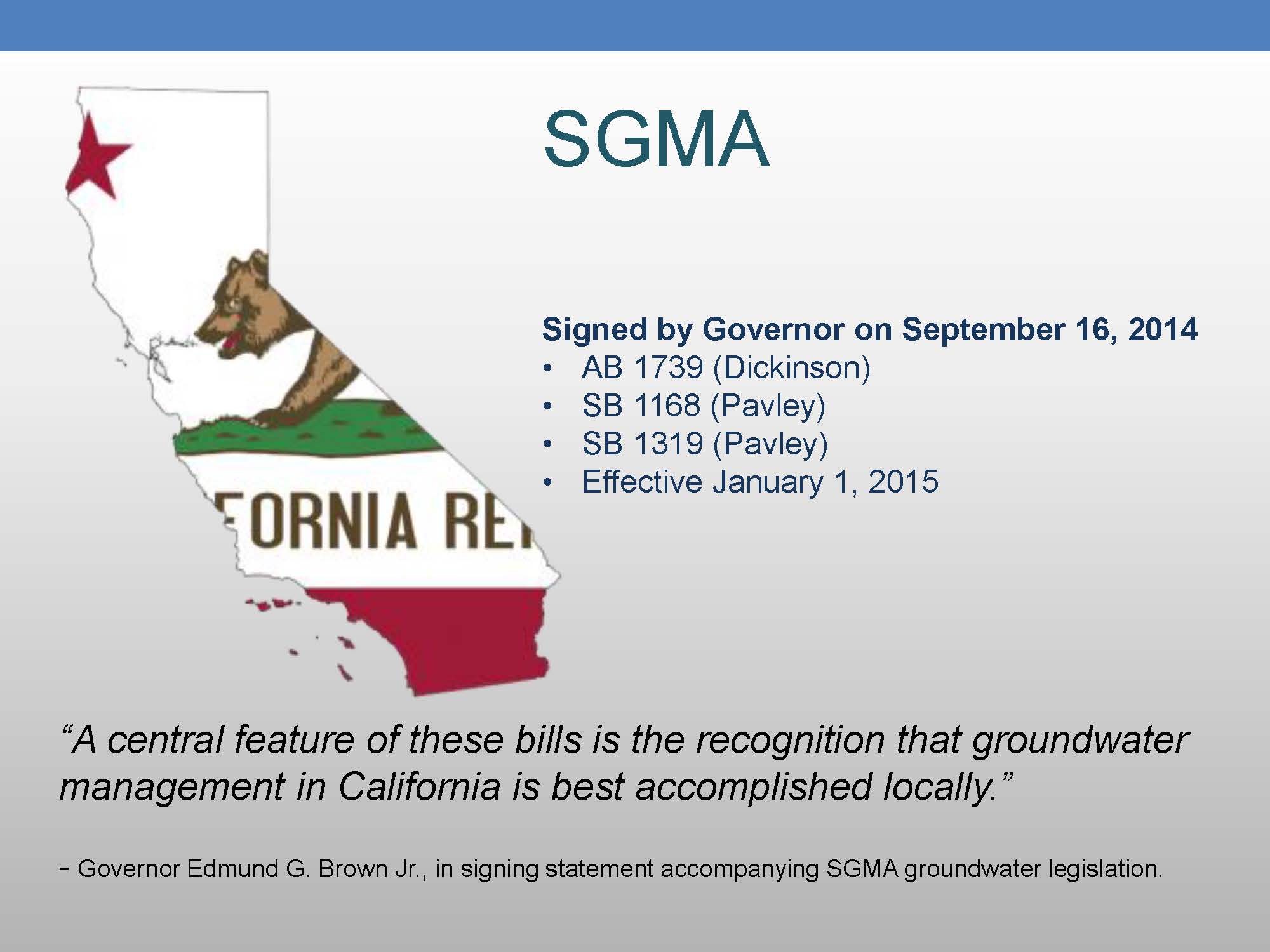 To address these challenges, California passed the Sustainable Groundwater Management Act in 2014, providing a regulatory framework for sustainable groundwater management for the first time in the state’s history. The Sustainable Groundwater Management Act, or SGMA, focuses on local control of groundwater basins, but providing a state backstop should sustainable management on the local level not occur.