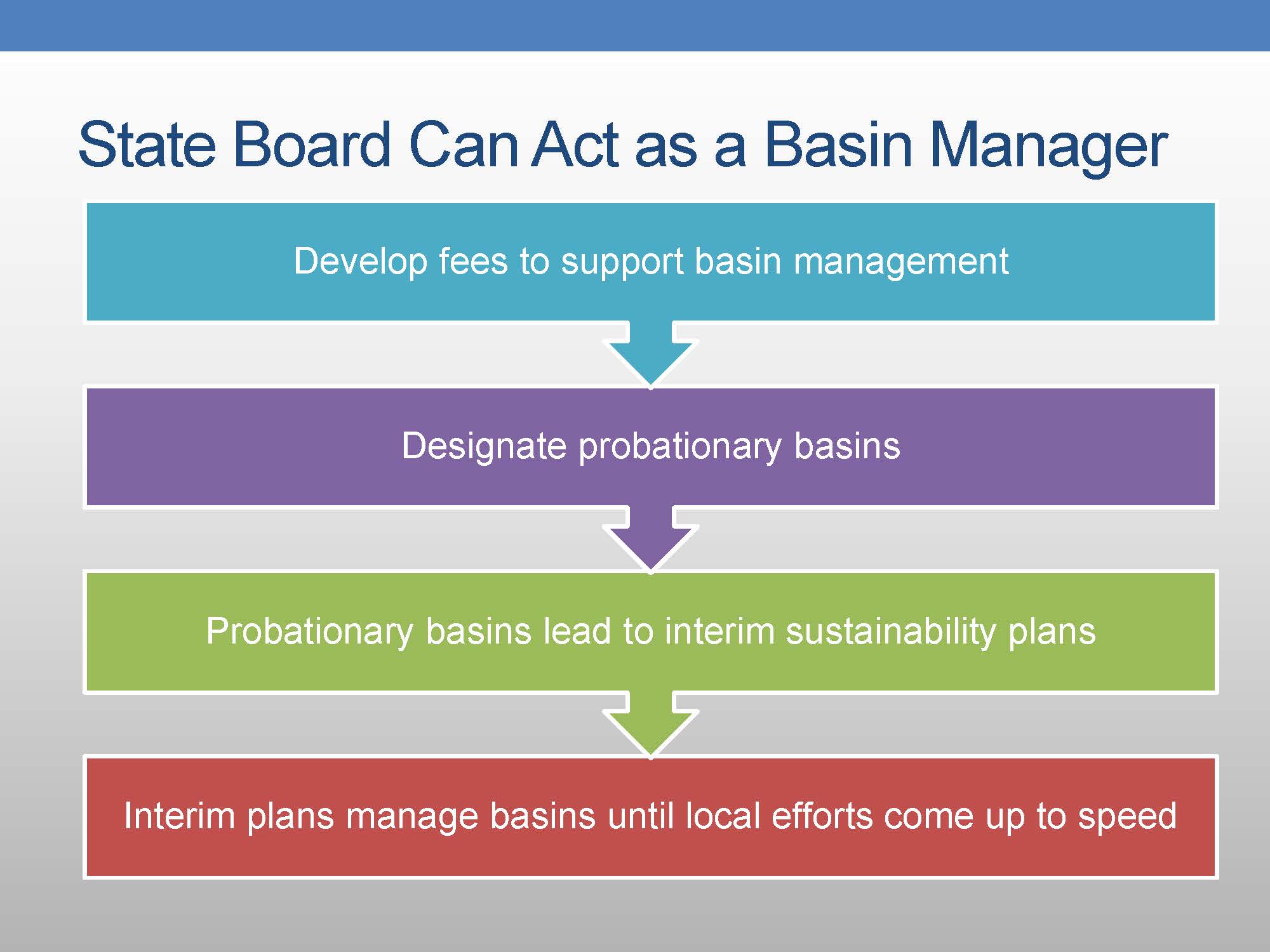 “Once we look at that data and we decide we need to take action, we need to help the locals effectively manage their own groundwater resources, and so we become effectively a basin manager,” he said. “As we manage the basin, we’ll need to set fees as we’re actually required to recover costs associated with state intervention. We’ll designate a basin as probationary; the probationary basin leads to an interim sustainability plan which is written and implemented by the State Water Resources Control Board to directly manage groundwater resources at the local level. Those interim plans manage the basin until local efforts come up to speed.”