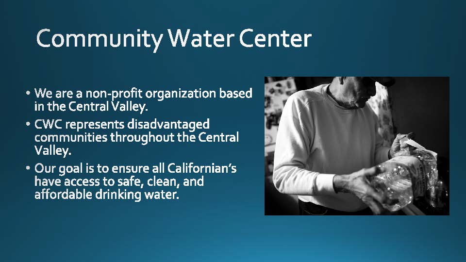 The Community Water Center is an environmental justice organization based in the San Joaquin Valley the works with some of the most disadvantaged communities in the state. “I’ve been working for over a decade with communities that lack access to safe drinking water every day,” Ms. Firestone said. “This problem started before the drought and it’s gotten really acute since the drought. Our goal is to ensure that we actually achieve the human right to water in the state of California and ensure all Californians have access to clean, safe, and affordable drinking water.”