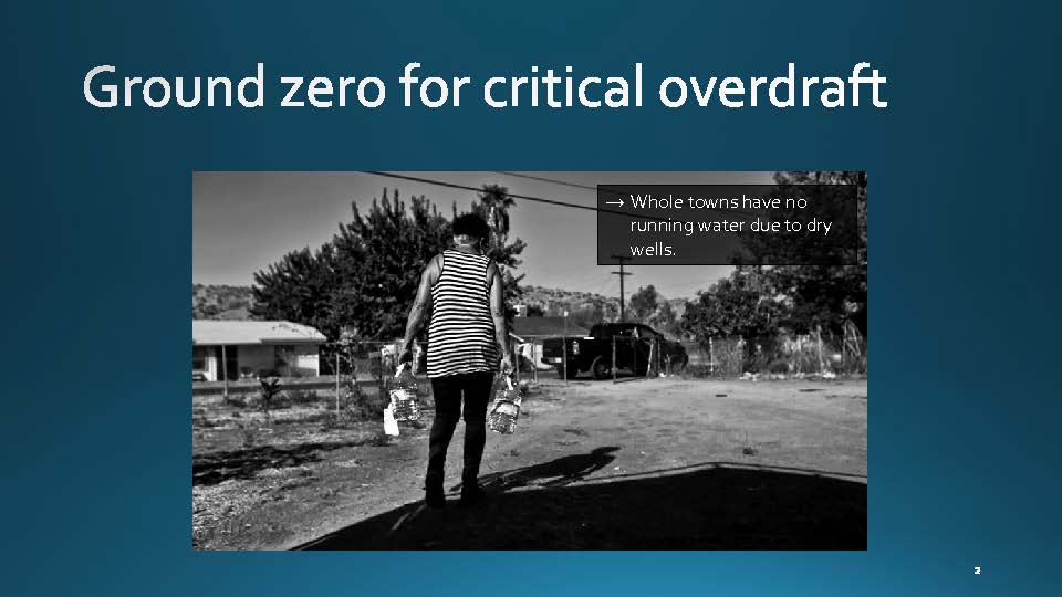 The Community Water Center’s main office is in Tulare County which is really ground zero for critical overdraft, she said. “We’ve had multiple communities run out of water this year; some of which have been for over 2 years with no running water in their house because of dry wells. Whole towns have gone dry. There are hundreds of communities in the state that rely on a single well, so if anything happens to that one well, if the water level drops below where we can pump, they have no supply at all. There’s no water at all for your basic human needs.”