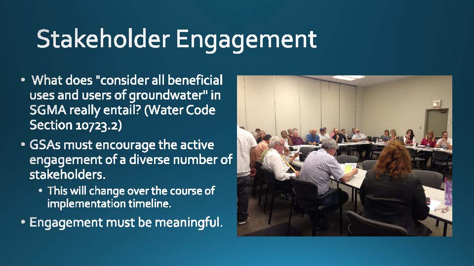 The law has requirements for stakeholder engagement, Ms. Firestone noted. “I think that really reflects this understanding that in order to successfully manage your common resource, you have to have all the diverse interests at the table to successfully implement sustainable management,” she said. “There’s substantive requirements to consider all beneficial uses and users of groundwater; there’s an explicit list of particular ones that includes and it really will depend on local conditions – who are the local beneficial uses and users of groundwater; it also includes the environment.”