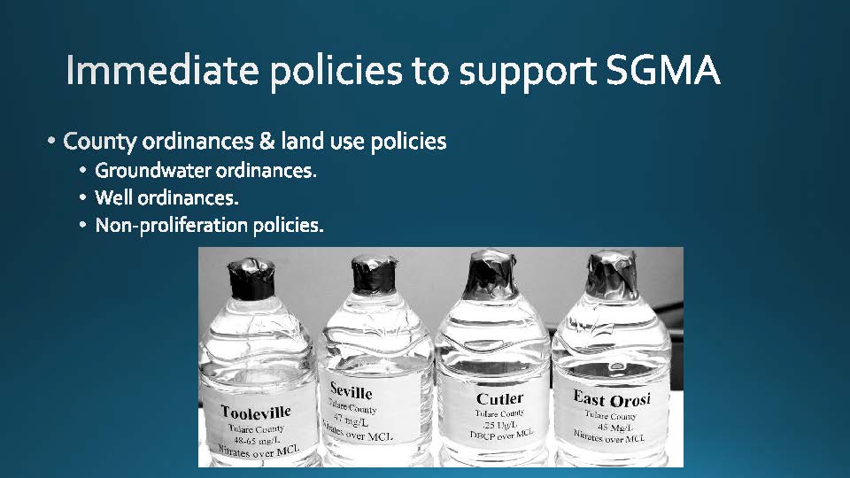 There are also a number of other issues, such as well construction ordinances. “As we focus on supply and water supply, we have to also acknowledge how tied that is into water quality issues,” she pointed out. “A lot of the issues are in groundwater well ordinances affect water supply and quality, and this leads into some of the emerging issues that I think will be key to the success of SGMA implementation.”