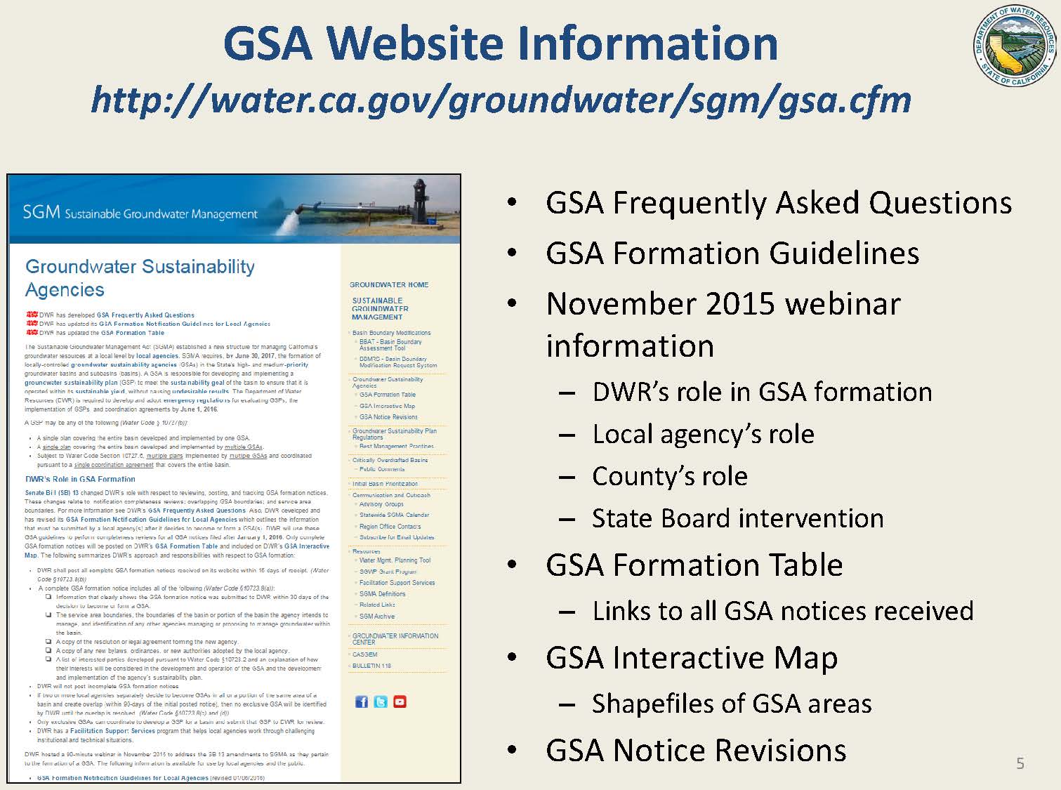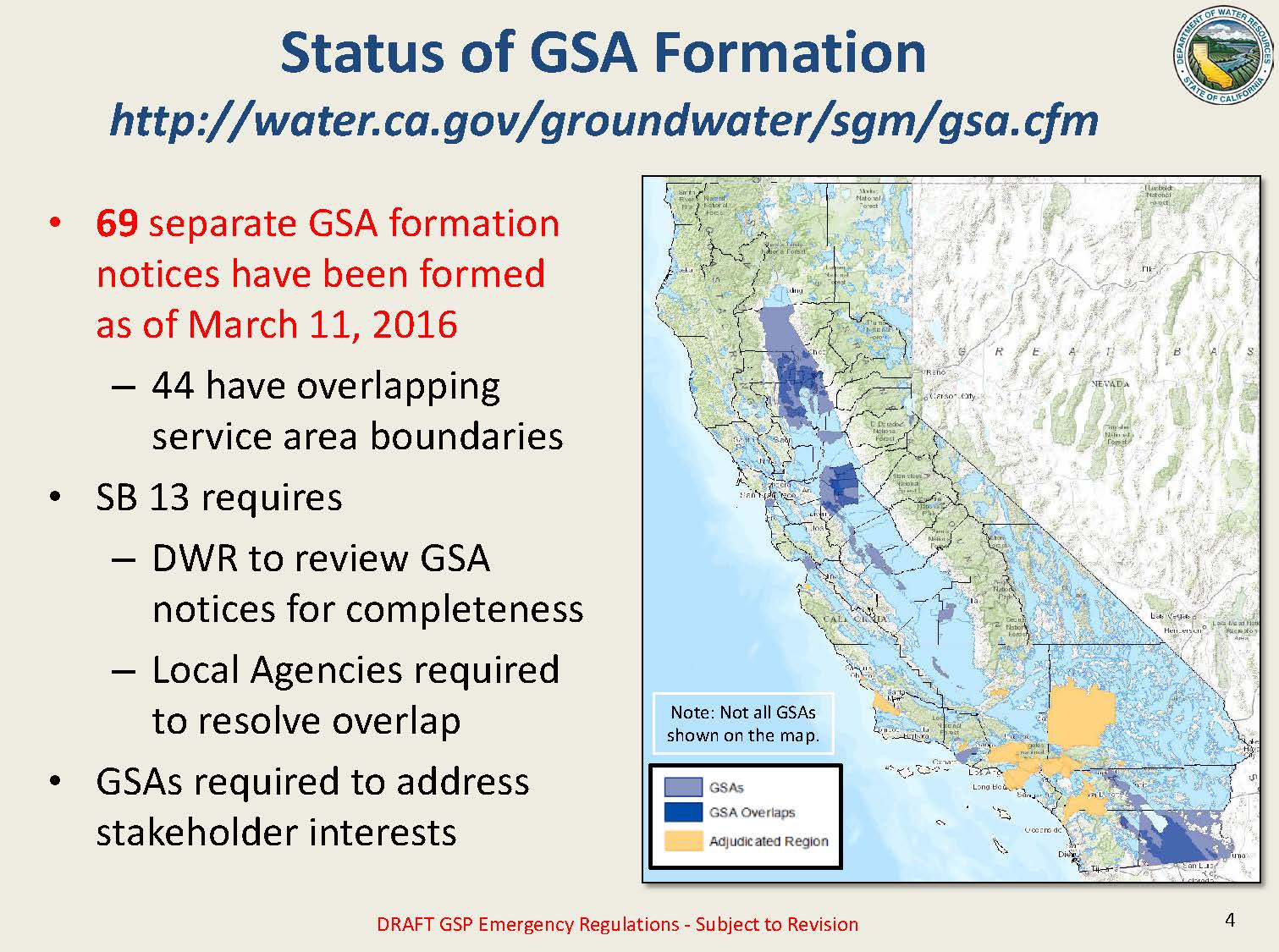 Trevor Joseph, Project Manager for the regulations, then took over the presentation, giving an update on the formation of Groundwater Sustainability Agencies (GSAs). He noted that the role of the Department in this is rather limited which is simply to evaluate the completeness of the local agency submittals and to post that information on the website.