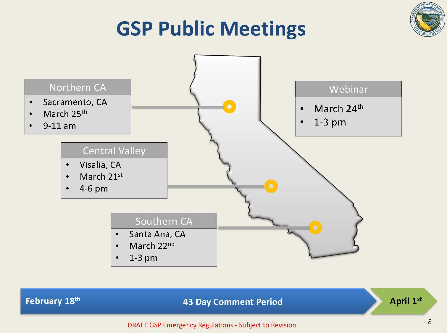 Implementation of the Sustainable Groundwater Management Act continues marching forward on schedule. The public comment period for the draft Groundwater Sustainability Plan regulations closes on April 1st, and this week, the Department of Water Resources is holding a series of public meetings as well as a webinar to hear comments.
