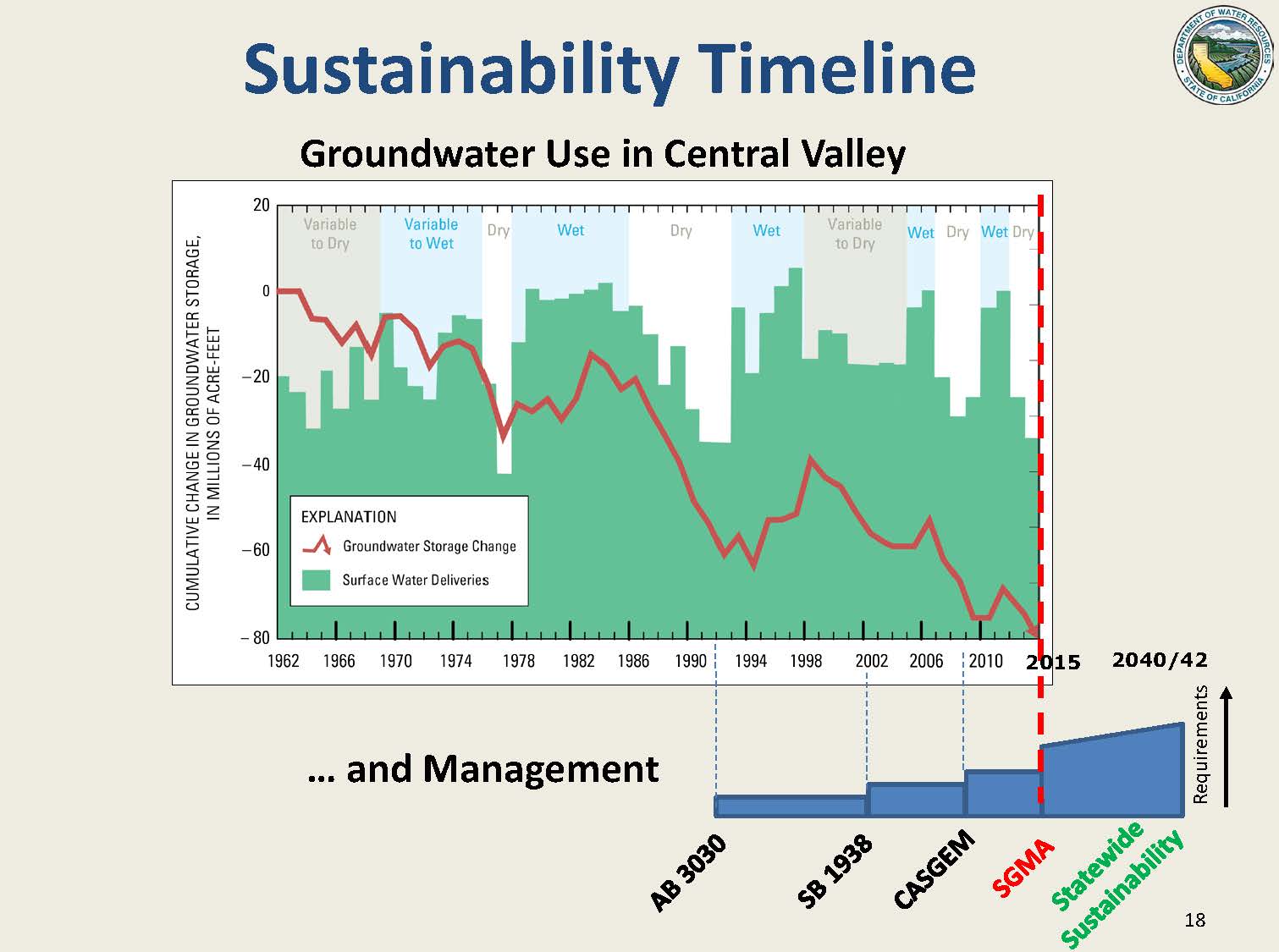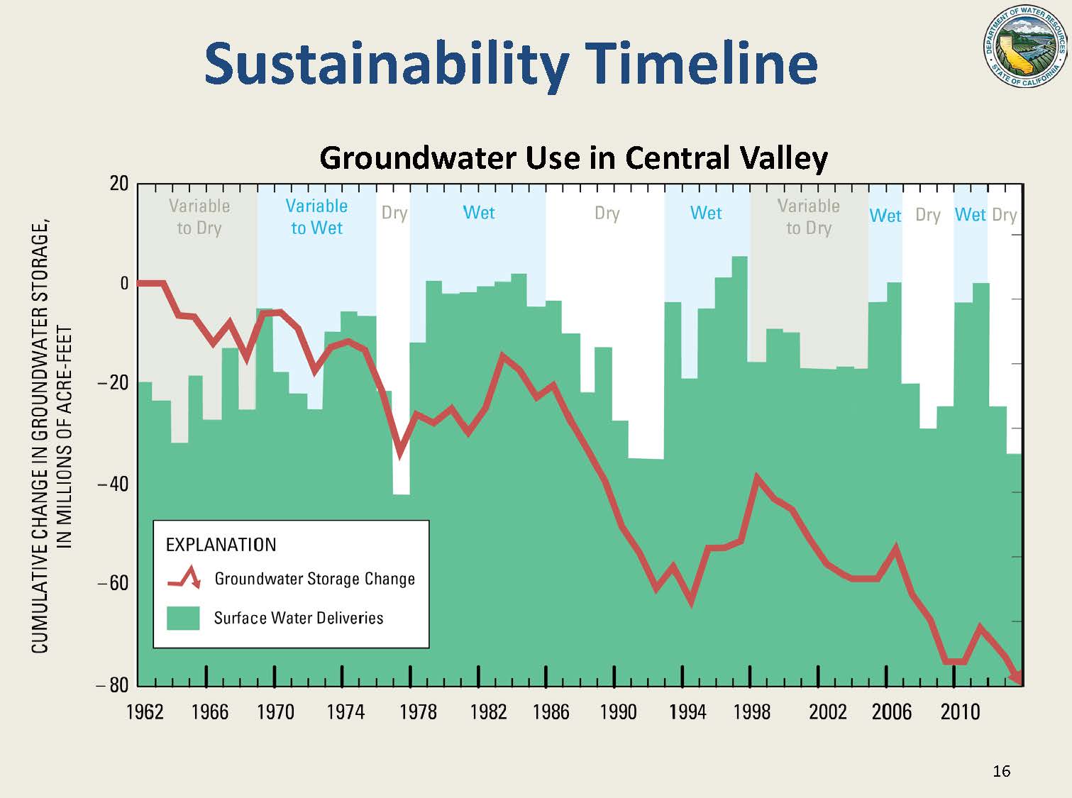 Mr. Joseph then turned to the sustainability timeline and the ramping up process, first presenting a graph from the USGS showing the cumulative change in groundwater storage over approximately 50 years. “The redline shows that there’s been approximately 80 MAF of groundwater storage that’s been lost due to groundwater pumping over the last 50 years,” he said. “That coincides with the blue bars of where there’s a lack of surface water availability – in the late 70s and again in the 90s. That lack of surface water availability has logically then resulted in additional groundwater pumping and a loss of storage.”