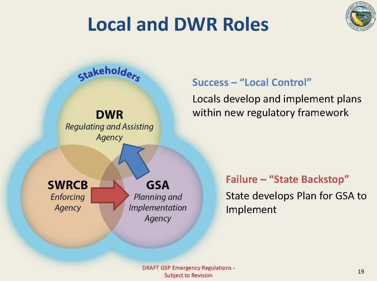 DWR plans to provide technical assistance by continuation of facilitation, the best management practices, Prop 1 funding, and providing statewide data sets, as well as individual regional office assistance to help with the implementation of these plans.
