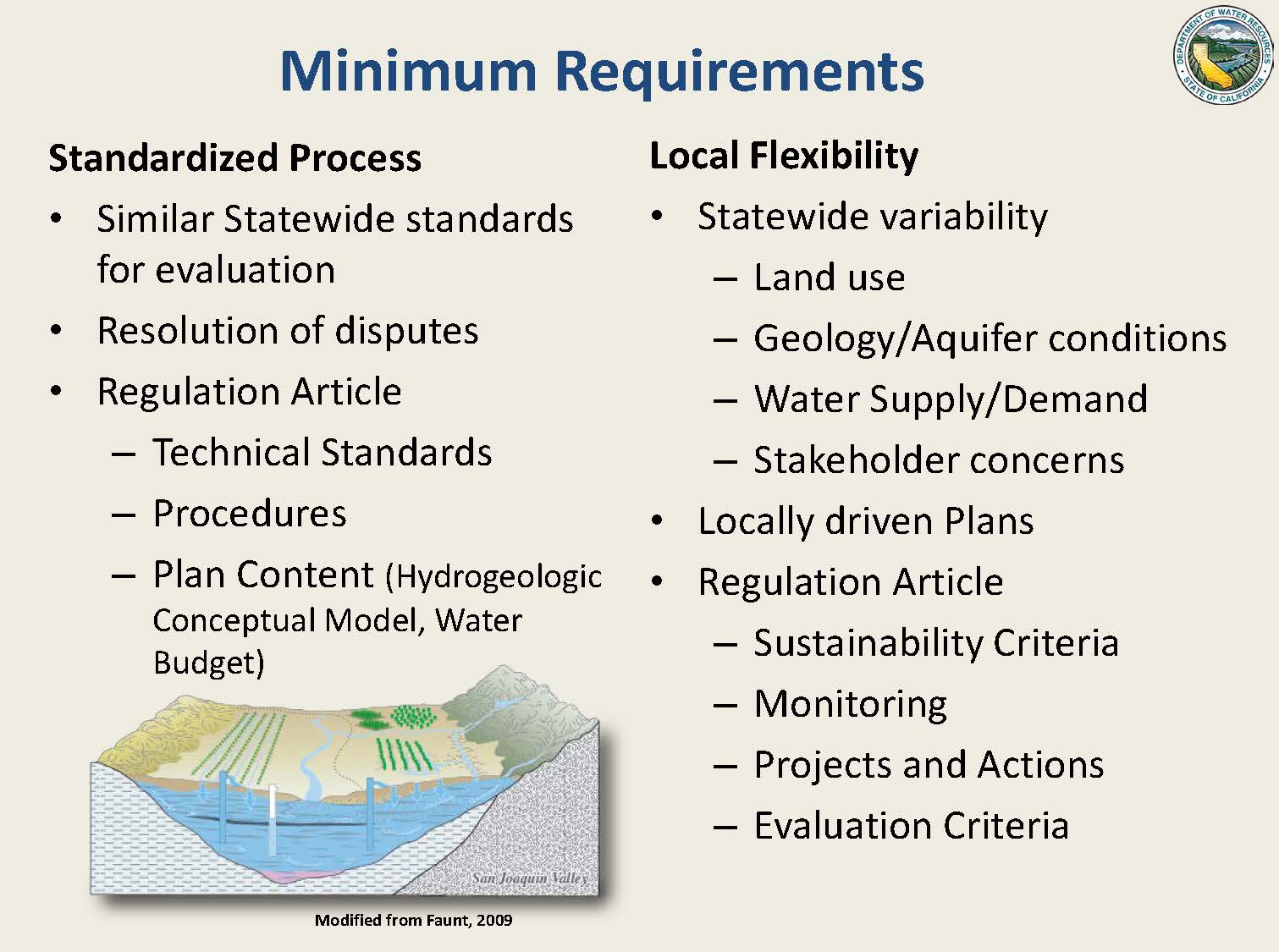 Mr. Joseph acknowledged that the standardized process does read a lot more prescriptive in the regulations. “But at the same time, we are writing other portions of the regulations for maximum local flexibility, and this is a requirement because there’s varied land use, varied geology, water supply and demand, stakeholder concerns, and the way folks want to manage groundwater, so the regulations need to be broad enough to encapsulate all those different variable conditions. They are locally driven plans so the regulation articles that we feel are more flexible are the sustainability criteria, the monitoring projects and actions, and the substantial evaluation criteria.”