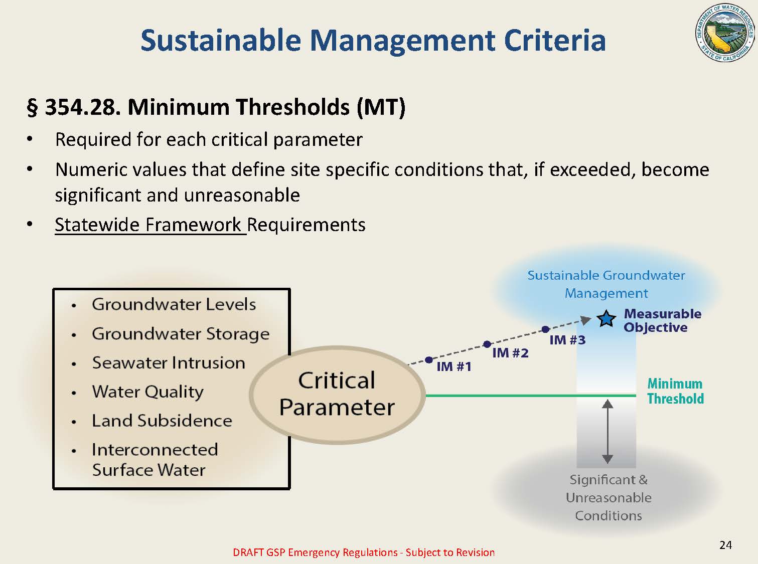 The sustainable management criteria section of the regulation is built upon the previous sections which require a description of the geology, the historical and current conditions, and the water budget.