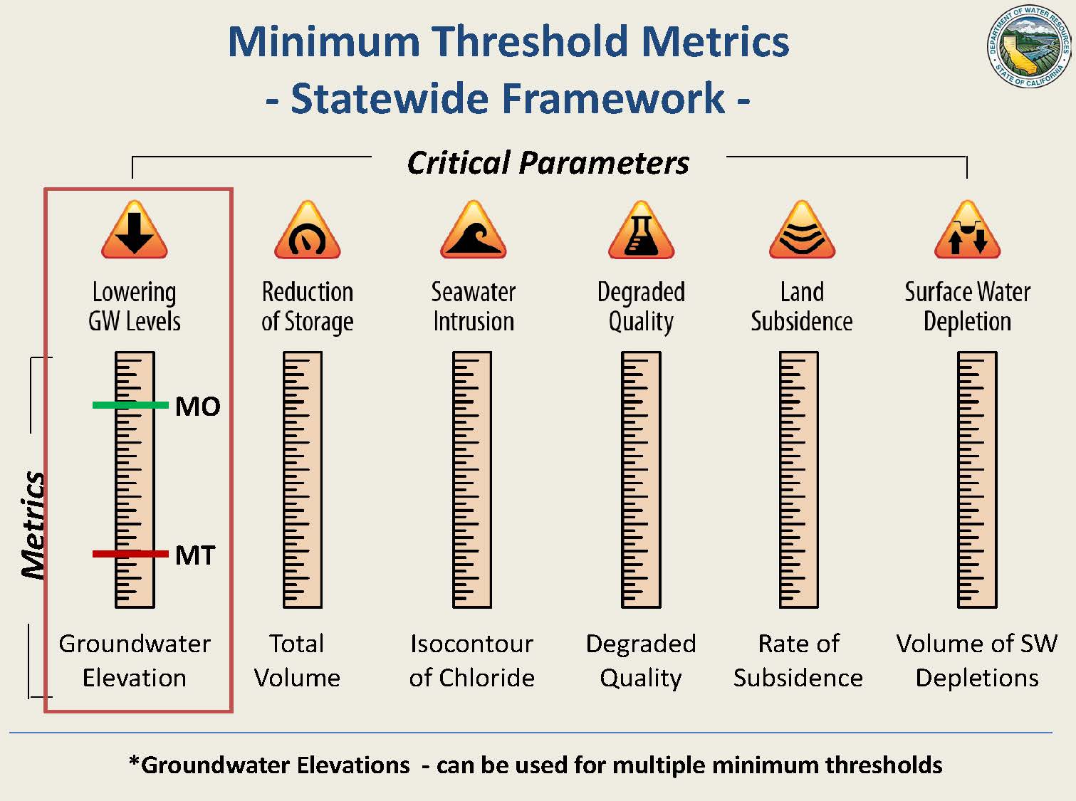 Critical parameters are the yardsticks that are used to monitor conditions in the basins; there are metrics assigned to each one for monitoring; for example, groundwater level is measured in feet/mean sea level, he said. “This is important to provide statewide consistency and uniformity; we don’t want different groups in the same basin monitoring groundwater levels with elevation and another group monitoring with satellite or remote sensing technology, so we want to have it standardized so we can clearly evaluate these metrics across the state.”