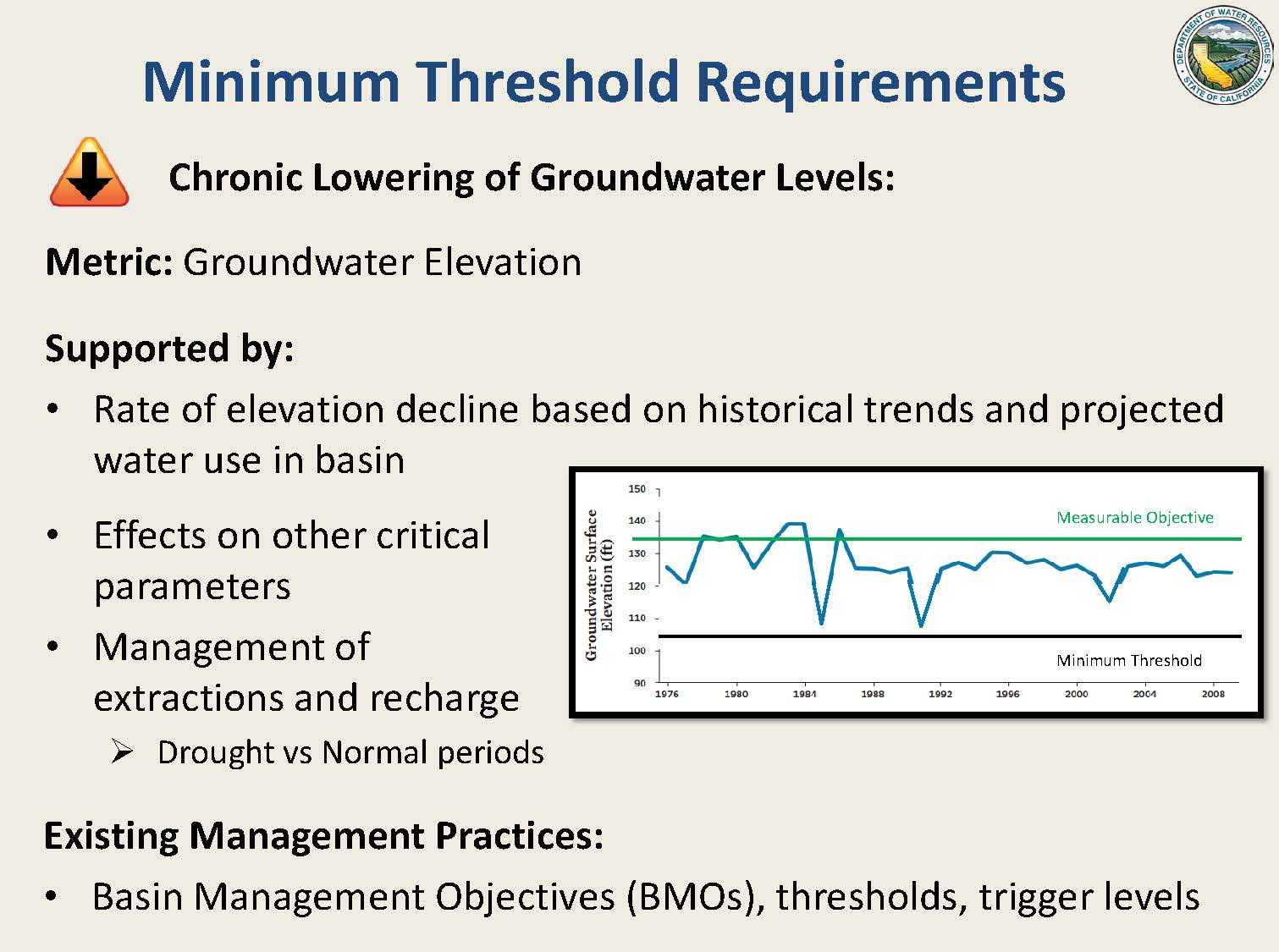 There are general requirements for how to set minimum thresholds, and specific requirements for each of the critical parameters, he said. “For groundwater levels, the metric needs to be measured in elevation, but it has to be supported by additional information. As you’re setting the measurable objective, there are certain components related to each of these critical parameters. For groundwater levels, it’s looking at the rate of elevation of groundwater decline based on historical trends and projected use in the basin; this gets to the hydrologic cycle, you want to see how your basin has responded in prior droughts and how it might respond to future droughts when you are setting your minimum threshold. You also have to look at the effects to other critical parameters, as where you set your minimum threshold for water levels could be very important on how that affects land subsidence in your basin, or some of the other undesirable results.”