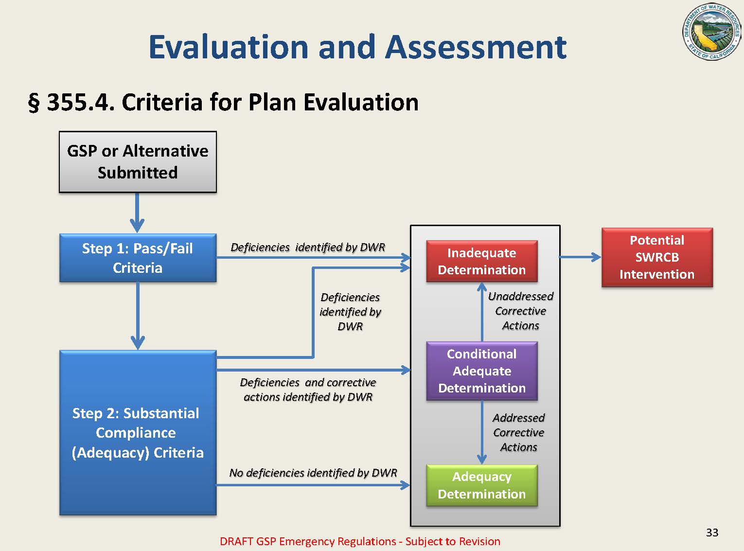 If the plan passes the first step, the second step would be substantial compliance criteria. “It’s an adequacy criteria. There are 11 criteria in the draft regulations currently, and it really allows DWR to make a subjective evaluation of the plan as to whether or not, looking at it as a whole, whether or not that plan will achieve sustainable groundwater management, and after implementation has started, whether it’s on course to meet sustainable groundwater management.”