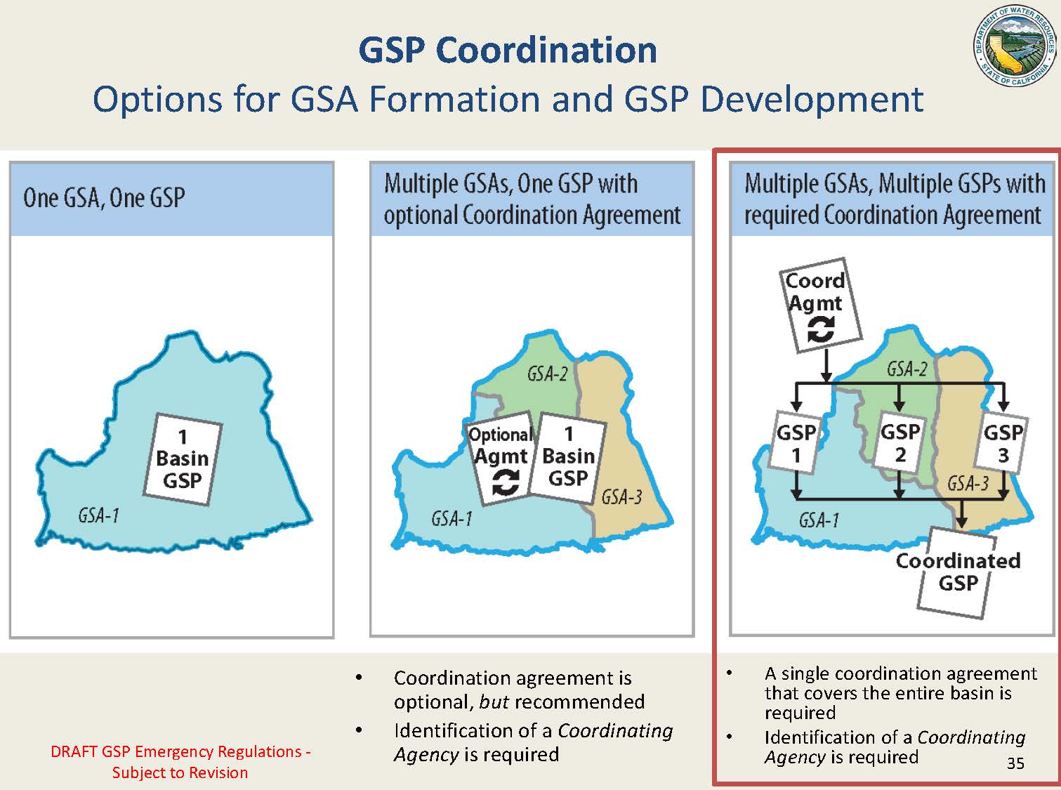 Mr. Joseph said they have received a number of comments on coordination agreements. He reminded that there can be three options to cover a basin or subbasin utilizing groundwater sustainability plans: One plan and one GSA in a basin, multiple GSAs completing one plan, and multiple GSAs completing multiple plans with a coordination agreement that links them together so the Department can understand how they are all going to work together to reach sustainable groundwater management in a basin or subbasin. In the case of multiple GSAs and a coordination agreement, there is also a requirement in the draft regulations that a coordinating agency be named.