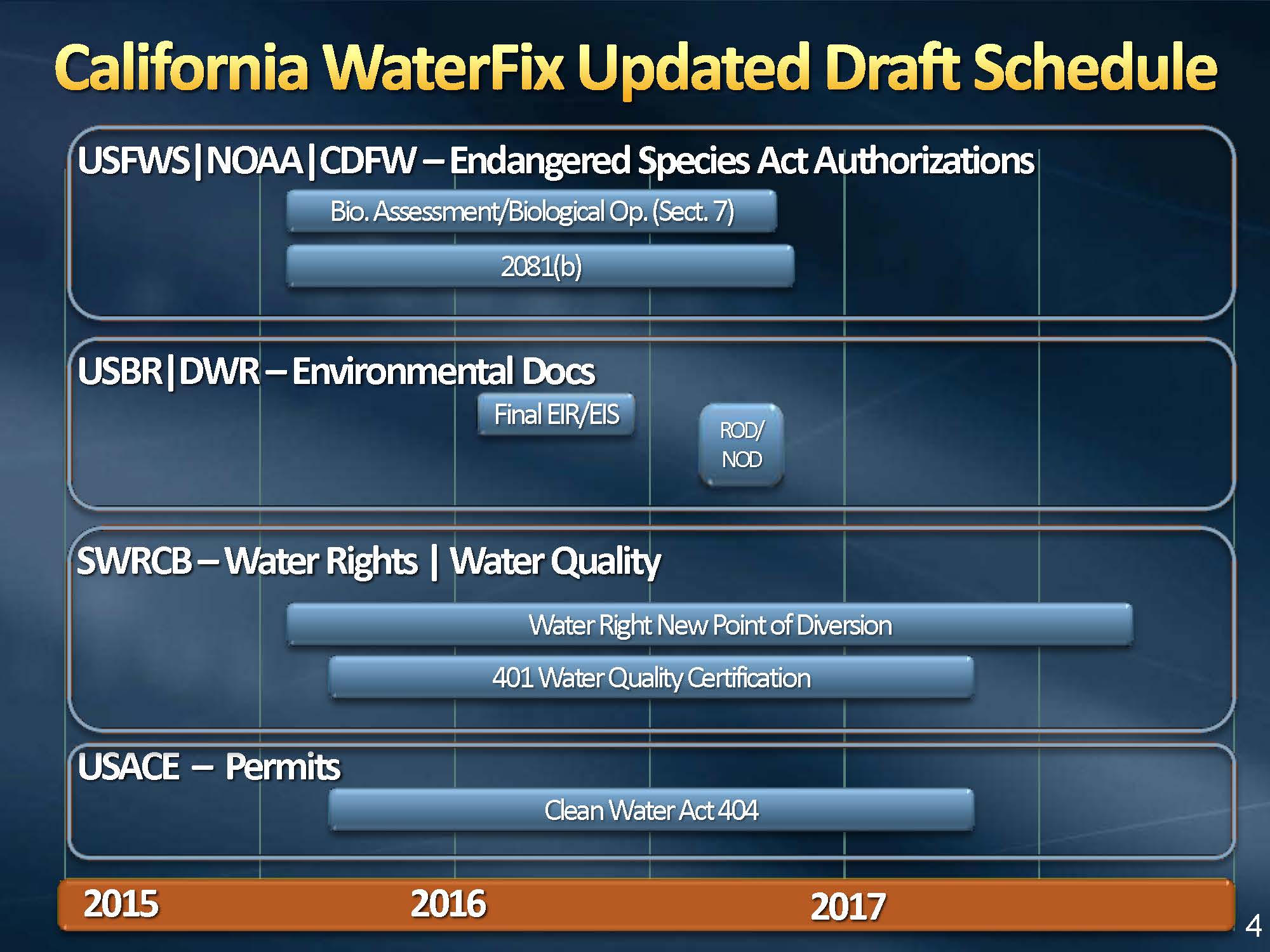 He then presented a timeline to visualize how the different processes fit together. He noted that the top timeline are the Endangered Species Act authorizations; the next section is the environmental documentation; followed by the water rights and water quality processes at the State Water Board; and lastly the Army Corps permit process.