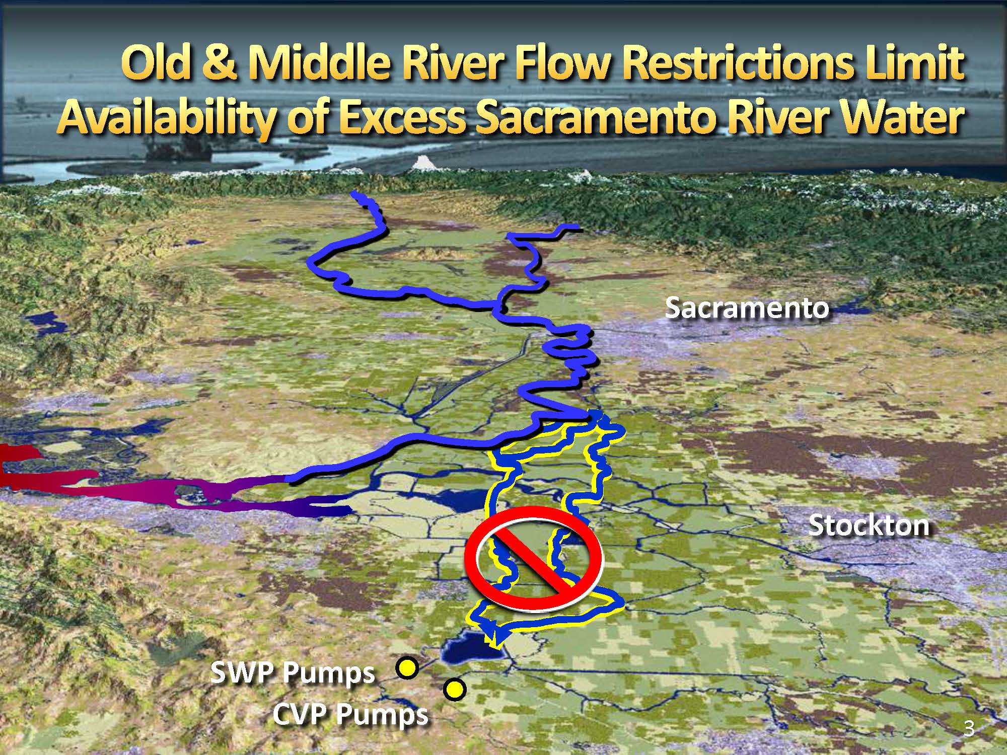 Mr. Neudeck explained that the projects are dependent on the Old and Middle rivers, highlighted in yellow, to bring stored water from the reservoirs up north – Shasta, Oroville, and Folsom as well as additional flood flows or excess flows that are in the system to the pumps. “Under the biological opinions, those rivers are restricted due to the low smelt numbers and restricted due to number of fish that you salvage and the turbidity in the system and other components,” he said.