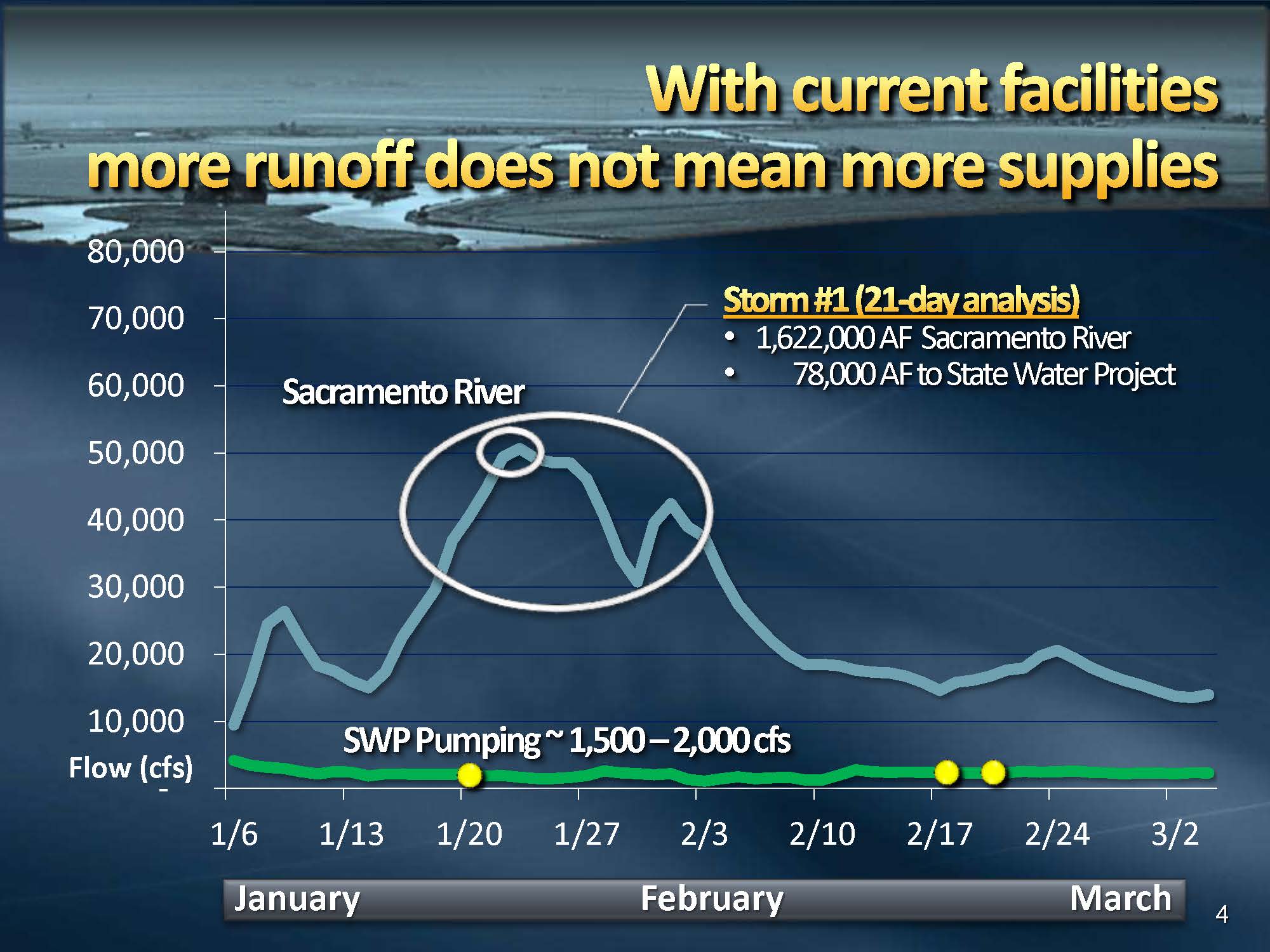 He then displayed a graph showing the flows in the Sacramento River for January through March, noting that the vertical axis is the flow of the Sacramento River in cubic feet per second. “It doesn’t include the San Joaquin River, it doesn’t include the eastside streams, but you can see that there’s a couple of storms that came during that period, top storm was about 50,000 cfs,” he said. “The green line represents the pumping that the State Water Project is doing right now; If you added on the Central Valley Project, it would be a little bit more, but that number comes out to be about 1500 to 2000 cfs.”