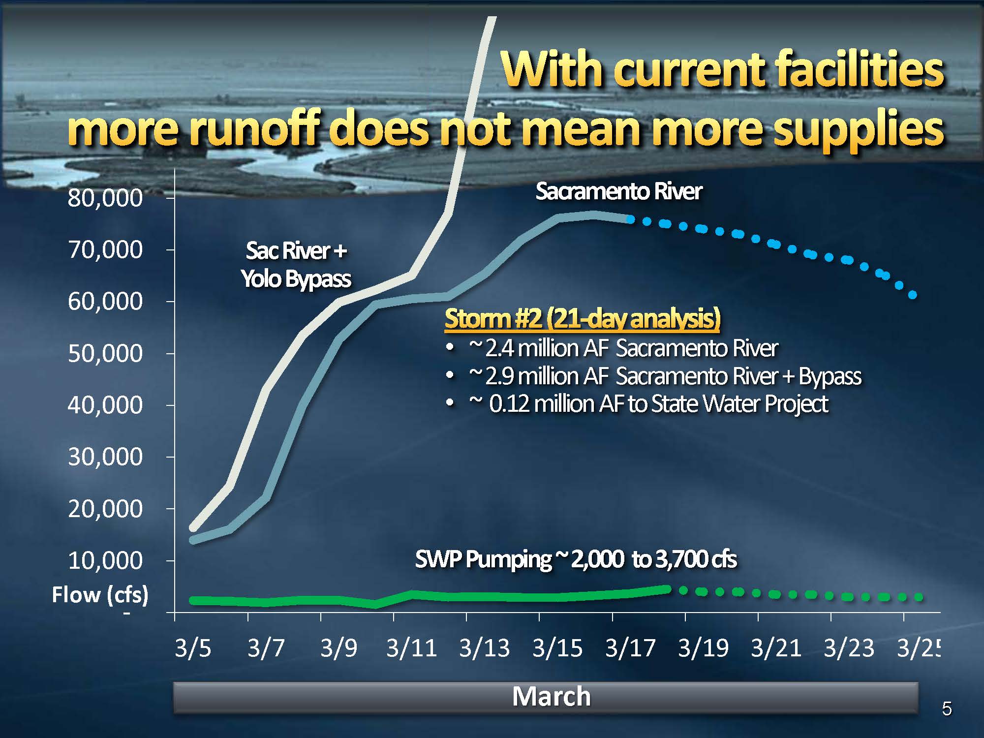 “With the recent storm that we saw this month come through the system, the dash line represents forecasted by flows over the next week or so,” he said. “If you add in the flows that were going down the Yolo Bypass, it gets up to about 145,000 AF … I think there was 60,000 cfs going down the bypass this year. If you just did a sample of 21 day analysis, you can see 2.4 MAF came down the Sacramento River. If you add on the bypass, that’s about another half a million acre-feet, and again the pumping at the State Water Project was about 120,000 AF total during that period.”